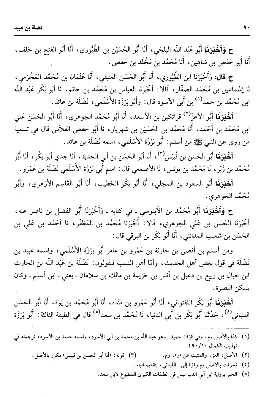 ح وأخبرنا أبو عبد الله البلخي أنا أبو الحسين بن الطيوري أنا أبو الفتح بن خلف أنا أبو حفص بن شاهين أنا محمد بن مخلد بن حفص ح قال وأخبرنا ابن الطيوري أنا أبو الحسن العتيقي أنا عثمان بن محمد المخرمي نا إسماعيل بن محمد الصفار قالا أخبرنا العباس بن محمد بن حاتم نا أبو بكر عبد الله ابن محمد بن احمد (1) بن أبي الأسود قال وابو برزة الأسلمي نضلة بن عائذ أخبرنا أبو الأعز (2) قراتكين بن الأسعد أنا أبو محمد الجوهري أنا أبو الحسن علي ابن محمد بن أحمد أنا محمد بن الحسين بن شهريار نا أبو حفص الفلاس قال في تسمية من روى عن النبي (صلى الله عليه وسلم) من أسلم أبو برزة الأسلمي اسمه نضلة بن عائذ أخبرنا أبو الحسن بن قبيس (3) أنا أبو الحسن بن أبي الحديد أنا جدي أبو بكر أنا أبو محمد بن زبر نا محمد بن يونس نا الأصمعي قال اسم أبي برزة الأسلمي نضلة بن عمرو أخبرنا أبو السعود بن المجلي أنا أبو بكر الخطيب أنا أبو القاسم الأزهري وأبو محمد الجوهري ح أخبرنا أبو محمد بن الآبنوسي في كتابه وأخبرنا أبو الفضل بن ناصر عنه أخبرنا الحسن بن علي الجوهري قالا أخبرنا محمد بن المظفر نا أحمد بن علي بن الحسن بن شعيب المدائني أنا أبو بكر بن البرقي قال ومن أسلم بن أفصى بن حارثة بن عمرو بن عامر أبو برزة الأسلمي واسمه عبيد بن نضلة في قول بعض أهل الحديث وأما أهل النسب فيقولون نضلة بن عبد الله بن الحارث ابن حبال بن ربيع بن دعبل بن أنس بن خزيمة بن مالك بن سلامان يعني ابن أسلم وكان يسكن البصرة أخبرنا أبو بكر اللفتواني أنا أبو عمرو بن منده أنا أبو محمد بن يوة أنا أبو الحسن اللنباني (4) حدثنا أبو بكر بن أبي الدنيا نا محمد بن سعد (5) قال في الطبقة الثالثة أبو برزة