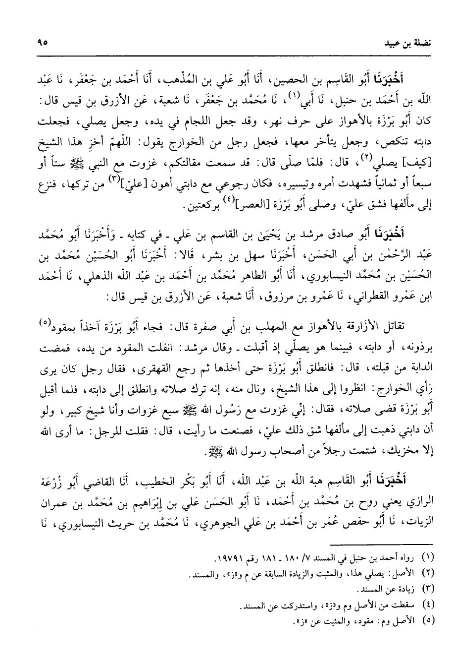 أخبرنا أبو القاسم بن الحصين أنا أبو علي بن المذهب أنا احمد بن جعفر نا عبد الله بن أحمد بن حنبل نا أبي (1) نا محمد بن جعفر نا شعبة عن الأزرق بن قيس قال كان أبو برزة بالأهواز على حرف نهر وقد جعل اللجام في يده وجعل يصلي فجعلت دابته تنكص وجعل يتأخر معها فجعل رجل من الخوارج يقول اللهم أخز هذا الشيخ كيف يصلي (2) قال فلما صلى قال قد سمعت مقالتكم غزوت مع النبي (صلى الله عليه وسلم) ستا أو سبعا أو ثمانيا فشهدت أمره وتيسيره فكان رجوعي مع دابتي أهون علي (3) من تركها فنزع إلى مألفها فشق علي وصلى أبو برزة العصر (4) بركعتين أخبرنا أبو صادق مرشد بن يحيى بن القاسم بن علي في كتابه وأخبرنا أبو محمد عبد الرحمن بن أبي الحسن أخبرنا سهل بن بشر قالا أخبرنا أبو الحسين محمد بن الحسين بن محمد النيسابوري أنا أبو الطاهر محمد بن أحمد بن عبد الله الذهلي نا أحمد ابن عمرو القطراني نا عمرو بن مرزوق أنا شعبة عن الأزرق بن قيس قال تقاتل الأزارقة بالأهواز مع المهلب بن أبي صفرة فجاء أبو برزة آخذا بمقود (5) برذونه أو دابته فبينما هو يصلي إذ أقبلت وقال مرشد انفلت المقود من يده فمضت الدابة من قبلته قال فانطلق أبو برزة حتى أخذها ثم رجع القهقري فقال رجل كان يرى رأي الخوارج انظروا إلى هذا الشيخ ونال منه إنه ترك صلاته وإنطلق إلى دابته فلما أقبل أبو برزة قضى صلاته فقال إني غزوت مع رسول الله (صلى الله عليه وسلم) سبع غزوات وأنا شيخ كبير ولو أن دابتي ذهبت إلى مألفها شق ذلك علي فصنعت ما رأيت قال فقلت للرجل ما أرى الله إلا مخزيك شتمت رجلا من أصحاب رسول الله (صلى الله عليه وسلم) أخبرنا أبو القاسم هبة الله بن عبد الله أنا أبو بكر الخطيب أنا القاضي أبو زرعة الرازي يعني روح بن محمد بن أحمد نا أبو الحسن علي بن إبراهيم بن محمد بن عمران الزيات نا أبو حفص عمر بن أحمد بن علي الجوهري نا محمد بن حريث النيسابوري نا