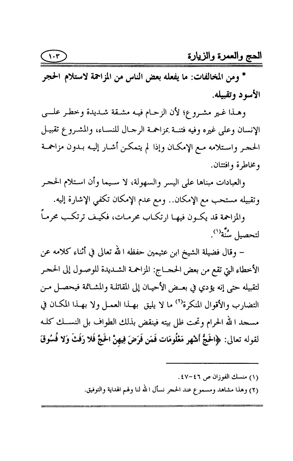 وقال فضيلة الشيخ ابن عثيمين حفظه الله تعالى في أثناء كلامه عن الأخطاء التي تقع من بعض الحجاج: المزاحمة الشديدة للوصول إلى الحجر لتقبيله حتى إنه يؤدي في بعض الأحيان إلى المقاتلة والمشاتمة فيحصل من التضارب والأقوال المنكرة2 ما لا يليق بهذا العمل ولا بهذا المكان في مسجد الله الحرام وتحت ظل بيته فينقض بذلك الطواف بل النسك كله لقوله تعالى: {الْحَجُّ أَشْهُرٌ مَعْلُومَاتٌ فَمَنْ فَرَضَ فِيهِنَّ الْحَجَّ فَلا رَفَثَ وَلا فُسُوقَ