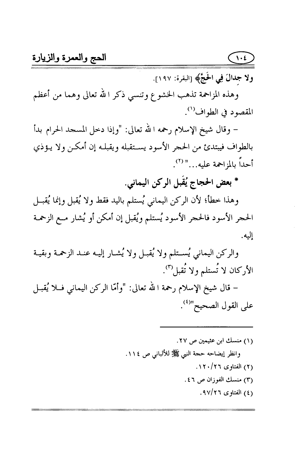 وهذا خطأ؛ لأن الركن اليماني يُستلم باليد فقط ولا يُقبل وإنما يُقبل الحجر الأسود فالحجر الأسود يُستلم ويُقبل إن أمكن أو يُشار مع الزحمة إليه. والركن اليماني يُستلم ولا يُقبل ولا يُشار إليه عند الزحمة وبقية الأركان لا تُستلم ولا تُقبل3.قال شيخ الإسلام رحمة الله تعالى:"وأمّا الركن اليماني فلا يُقبل على القول الصحيح"4.