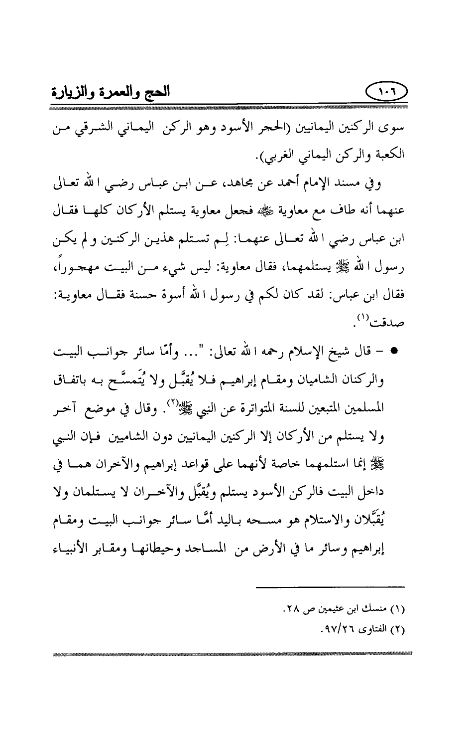 قال شيخ الإسلام رحمه الله تعالى:"وأمّا سائر جوانب البيت والركنان الشاميان ومقام إبراهيم فلا يُقبَّل ولا يُتَمسَّح به باتفاق المسلمين المتبعين للسنة المتواترة عن النبي صلي الله عليه وسلم2. وقال في موضع آخر ولا يستلم من الأركان إلا الركنين اليمانيين دون الشاميين فإن النبي صلي الله عليه وسلم إنما استلمهما خاصة لأنهما على قواعد إبراهيم والآخران هما في داخل البيت فالركن الأسود يستلم ويُقبَّل والآخران لا يستلمان ولا يُقَبَّلان والاستلام هو مسحه باليد أمَّا سائر جوانب البيت ومقام إبراهيم وسائر ما في الأرض من المساجد وحيطانها ومقابر الأنبياء