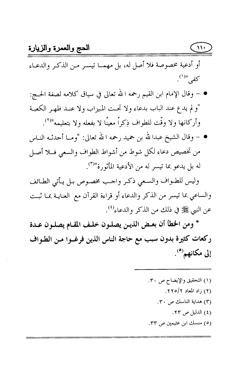 أو أدعية مخصوصة فلا أصل له، بل مهما تيسر من الذكر والدعاء كفى"1وقال الإمام ابن القيم رحمه الله تعالى في سياق كلامه لصفة الحج:"ولم يدع عند الباب بدعاء ولا تحت الميزاب ولا عند ظهر الكعبة وأركانها ولا وقّت للطواف ذِكراً معينًا لا بفعله ولا بتعليمه"2.وقال الشيخ عبد الله بن حميد رحمه الله تعالى:"وما أحدثه الناس من تخصيص دعاء لكل شوط من أشواط الطواف والسعي فلا أصل له بل يدعو بما تيسر له من الأدعية المأثورة"3.وليس للطواف والسعي ذكر واجب مخصوص بل يأتي الطائف والساعي بما تيسر من الذكر والدعاء أو قراءة القرآن مع العناية بما ثبت عن النبي صلي الله عليه وسلم في ذلك من الذكر والدعاء4.ومن الخطأ أن بعض الذين يصلون خلف المقام يصلون عدة ركعات كثيرة بدون سبب مع حاجة الناس الذين فرغوا من الطواف إلى مكانهم5