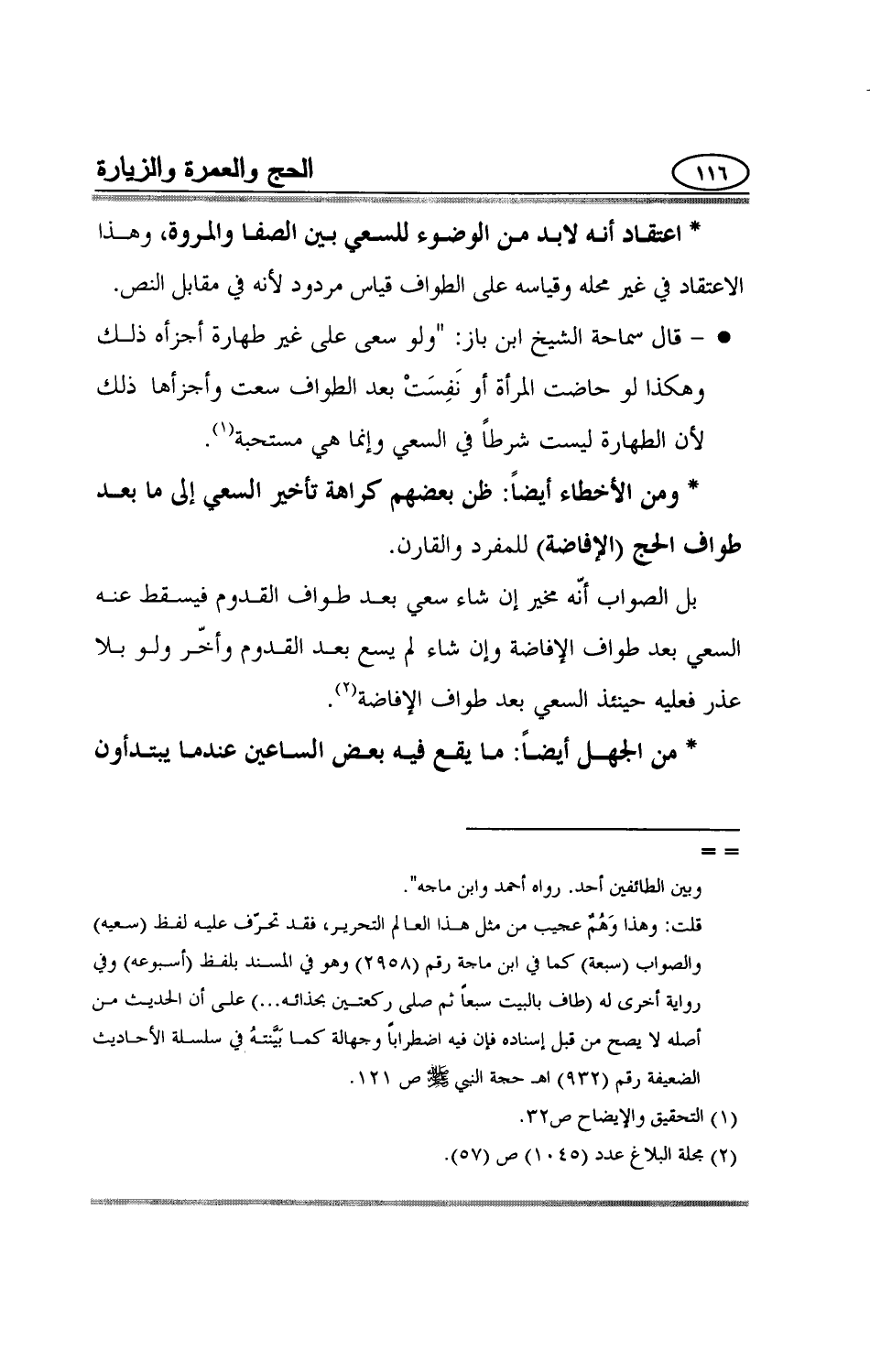 اعتقاد أنه لابد من الوضوء للسعي بين الصفا والمروة، وهذا الاعتقاد في غير محله وقياسه على الطواف قياس مردود لأنه في مقابل النص.