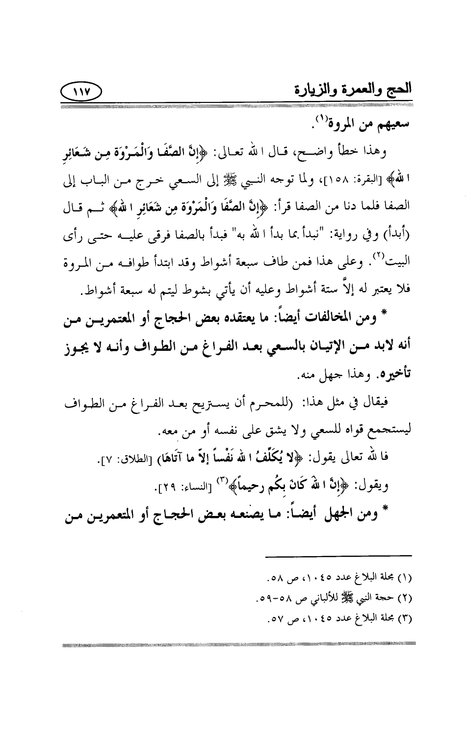 ومن المخالفات أيضاً: ما يعتقده بعض الحجاج أو المعتمرين من أنه لابد من الإتيان بالسعي بعد الفراغ من الطواف وأنه لا يجوز تأخيره. وهذا جهل منه. فيقال في مثل هذا:"للمحرم أن يستريح بعد الفراغ من الطواف ليستجمع قواه للسعي ولا يشق على نفسه أو من معه. فالله تعالى يقول: {لا يُكَلِّفُ اللَّهُ نَفْساً إِلَّا مَا آتَاهَا} [الطلاق:7] .ويقول: {إِنَّ اللَّهَ كَانَ بِكُمْ رَحِيماً} 3 [النساء:29] .