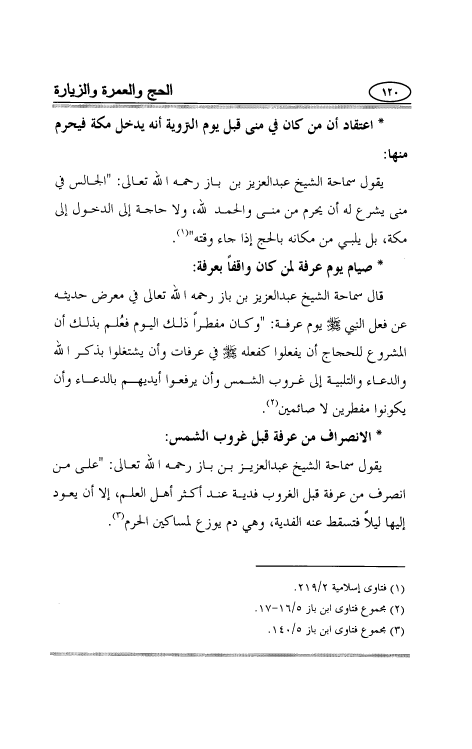 يقول سماحة الشيخ عبد العزيز بن باز رحمه الله تعالى:"على من انصرف من عرفة قبل الغروب فدية عند أكثر أهل العلم، إلا أن يعود إليها ليلاً فتسقط عنه الفدية، وهي دم يوزع لمساكين الحرم3.