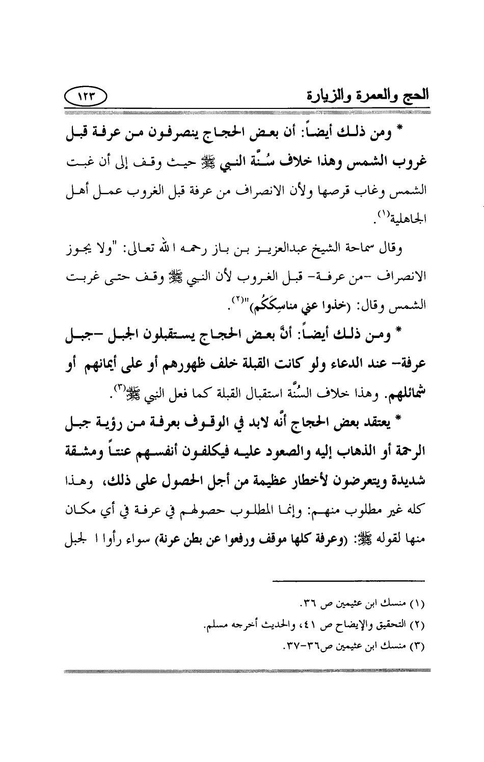 ومن ذلك أيضاً: أن بعض الحجاج ينصرفون من عرفة قبل غروب الشمس وهذا خلاف سُنَّة النبي صلي الله عليه وسلم حيث وقف إلى أن غبت الشمس وغاب قرصها ولأن الانصراف من عرفة قبل الغروب عمل أهل الجاهلية1.