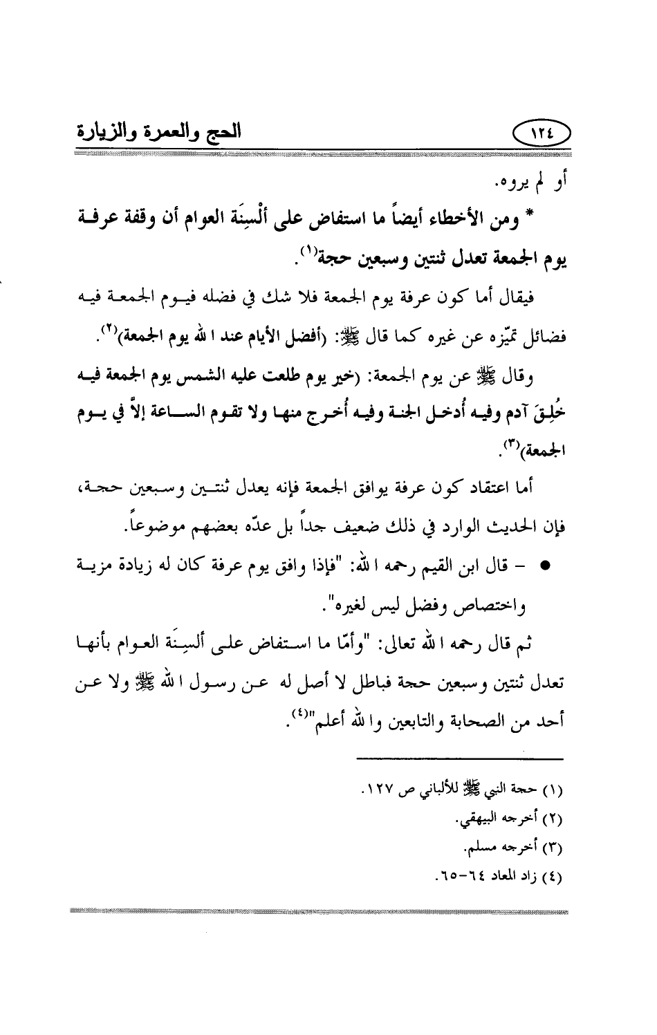 ومن الأخطاء أيضاً ما استفاض على ألْسِنَة العوام أن وقفة عرفة يوم الجمعة تعدل ثنتين وسبعين حجة1.