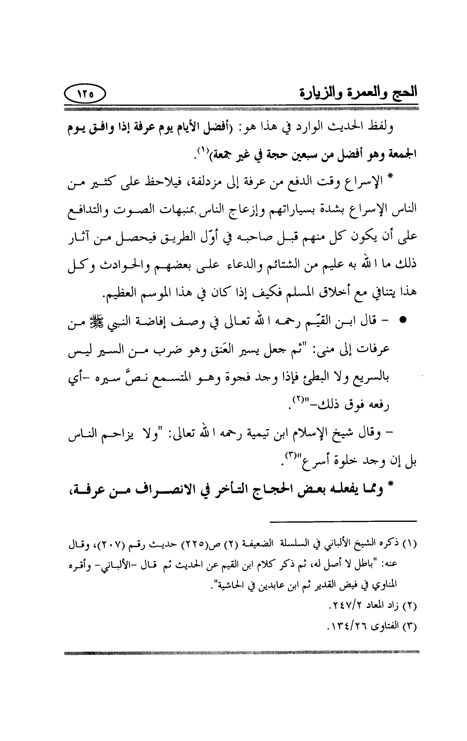 ولفظ الحديث الوارد في هذا هو:"أفضل الأيام يوم عرفة إذا وافق يوم الجمعة وهو أفضل من سبعين حجة في غير جمعة) 1 الإسراع وقت الدفع من عرفة إلى مزدلفة، فيلاحظ على كثير من الناس الإسراع بشدة بسياراتهم وإزعاج الناس بمنبهات الصوت والتدافع على أن يكون كل منهم قبل صاحبه في أوّل الطريق فيحصل من آثار ذلك ما الله به عليم من الشتائم والدعاء على بعضهم والحوادث وكل هذا يتنافي مع أخلاق المسلم فكيف إذا كان في هذا الموسم العظيم قال ابن القيّم رحمه الله تعالى في وصف إفاضة النبي صلي الله عليه وسلم من عرفات إلى منى:"ثم جعل يسير العَنق وهو ضرب من السير ليس بالسريع ولا البطئ فإذا وجد فجوة وهو المتسمع نصَّ سيره -أي رفعه فوق ذلك-"2وقال شيخ الإسلام ابن تيمية رحمه الله تعالى:"ولا يزاحم الناس بل إن وجد خلوة أسرع"3.