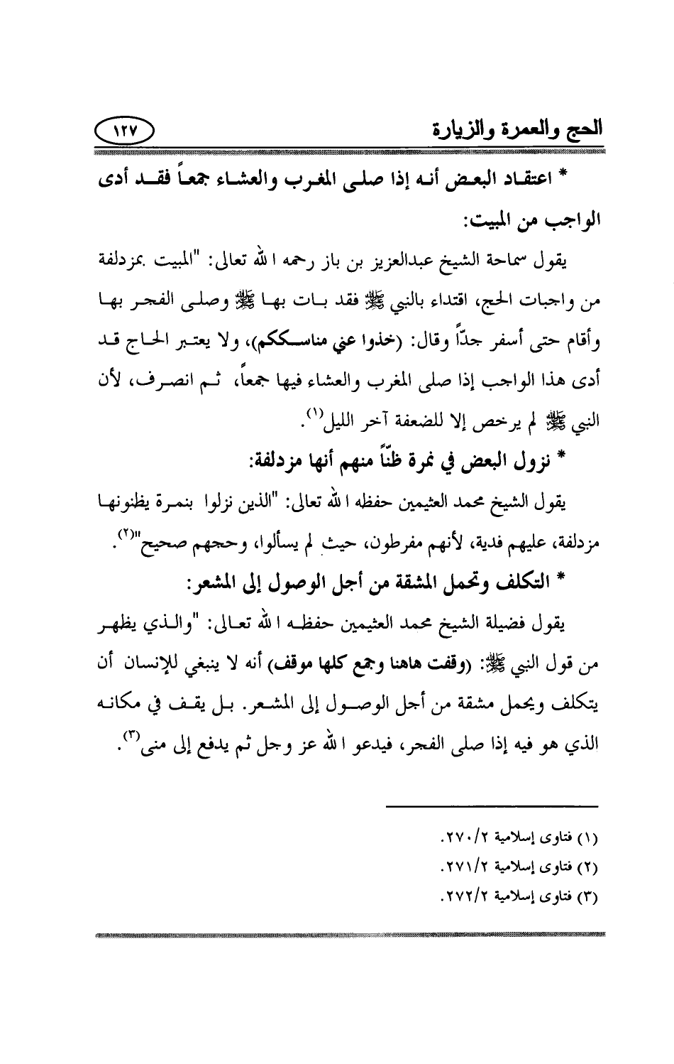 يقول سماحة الشيخ عبد العزيز بن باز رحمه الله تعالى:"المبيت بمزدلفة من واجبات الحج، اقتداء بالنبي صلي الله عليه وسلم فقد بات بها صلي الله عليه وسلم وصلى الفجر بها وأقام حتى أسفر جدّاً وقال:"خذوا عني مناسككم"، ولا يعتبر الحاج قد أدى هذا الواجب إذا صلى المغرب والعشاء فيها جمعاً، ثم انصرف، لأن النبي صلي الله عليه وسلم لم يرخص إلا للضعفة آخر الليل1.