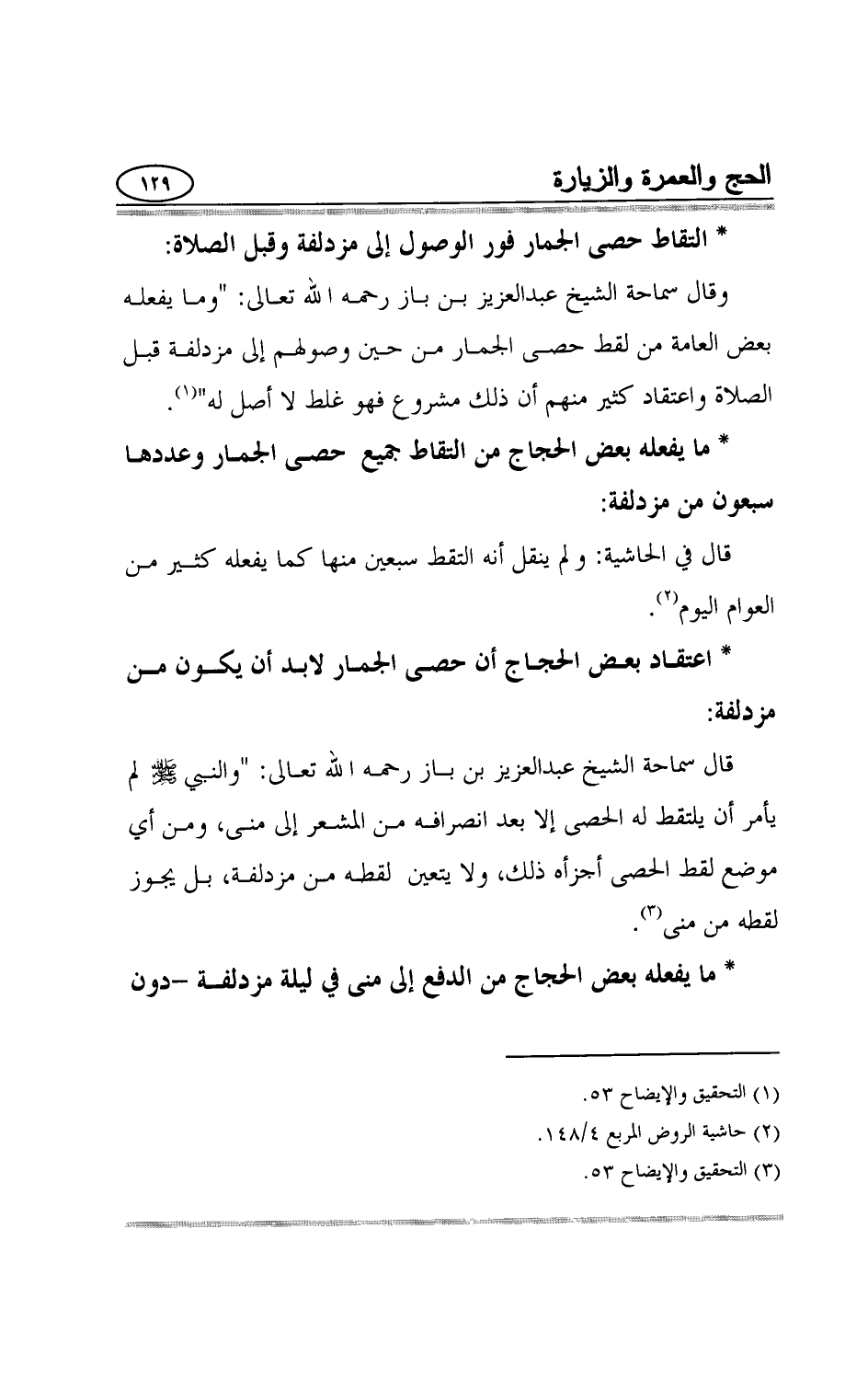 وقال سماحة الشيخ عبد العزيز بن باز رحمه الله تعالى:"وما يفعله بعض العامة من لقط حصى الجمار من حين وصولهم إلى مزدلفة قبل الصلاة واعتقاد كثير منهم أن ذلك مشروع فهو غلط لا أصل له"1.