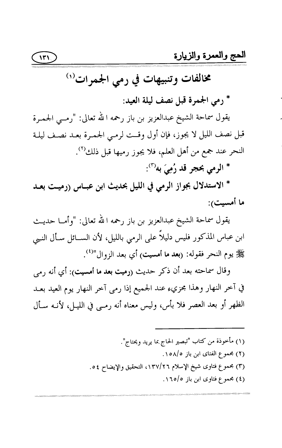 وقال سماحته بعد أن ذكر حديث "رميت بعد ما أمسيت" أي أنه رمى في آخر النهار وهذا مجزيء عند الجميع إذا رمى آخر النهار يوم العيد بعد الظهر أو بعد العصر فلا بأس، وليس معناه أنه رمى في الليل، لأنه سأل