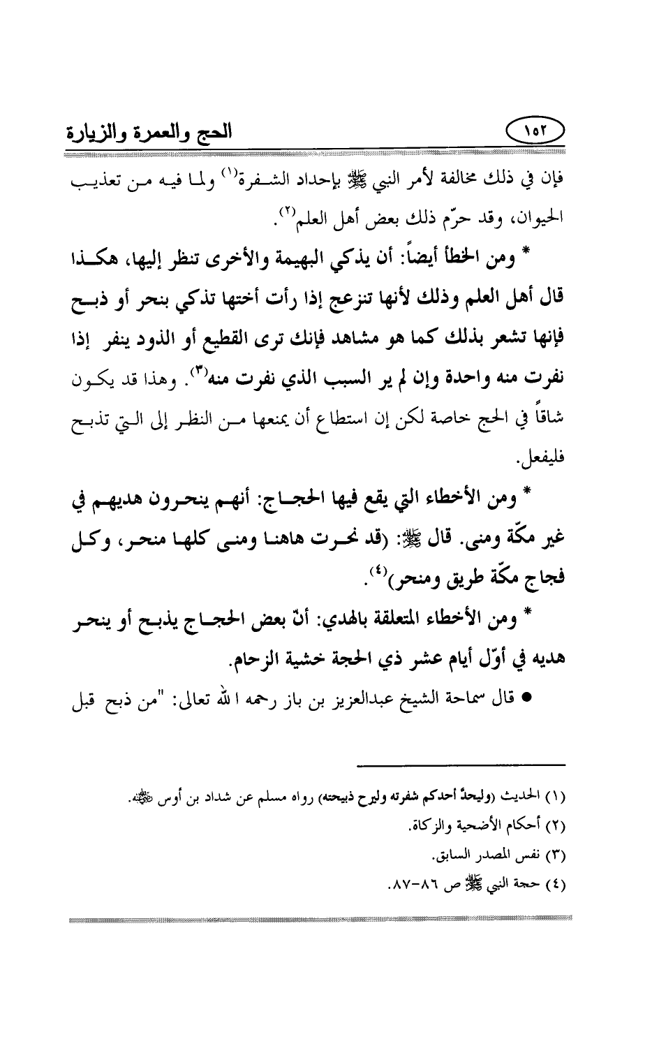 ومن الخطأ أيضاً: أن يذكي البهيمة والأخرى تنظر إليها، هكذا قال أهل العلم وذلك لأنها تنزعج إذا رأت أختها تذكي بنحر أو ذبح فإنها تشعر بذلك كما هو مشاهد فإنك ترى القطيع أو الذود ينفر إذا نفرت منه واحدة وإن لم ير السبب الذي نفرت منه3. وهذا قد يكون شاقاً في الحج خاصة لكن إن استطاع أن يمنعها من النظر إلى التي تذبح فليفعل.