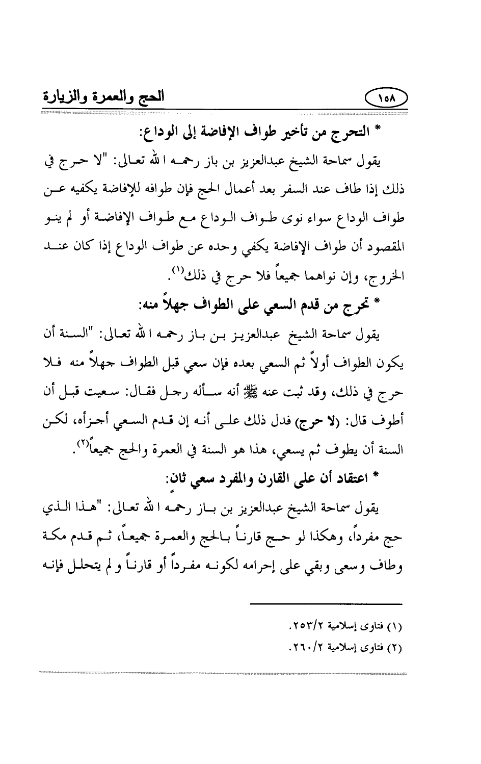 يقول سماحة الشيخ عبد العزيز بن باز رحمه الله تعالى:"السنة أن يكون الطواف أولاً ثم السعي بعده فإن سعي قبل الطواف جهلاً منه فلا حرج في ذلك، وقد ثبت عنه صلي الله عليه وسلم أنه سأله رجل فقال: سعيت قبل أن أطوف قال:"لا حرج" فدل ذلك على أنه إن قدم السعي أجزأه، لكن السنة أن يطوف ثم يسعي، هذا هو السنة في العمرة والحج جميعاً3.