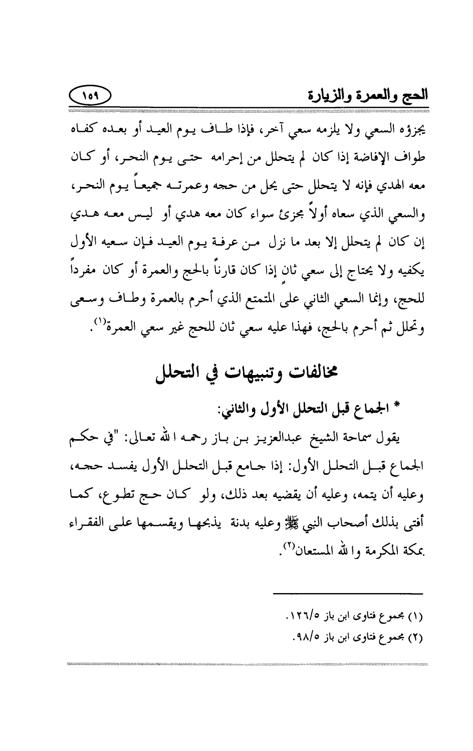 يقول سماحة الشيخ عبد العزيز بن باز رحمه الله تعالى:"في حكم الجماع قبل التحلل الأول: إذا جامع قبل التحلل الأول يفسد حجه، وعليه أن يتمه، وعليه أن يقضيه بعد ذلك، ولو كان حج تطوع، كما أفتى بذلك أصحاب النبي صلي الله عليه وسلم وعليه بدنة يذبحها ويقسمها على الفقراء بمكة المكرمة والله المستعان2.