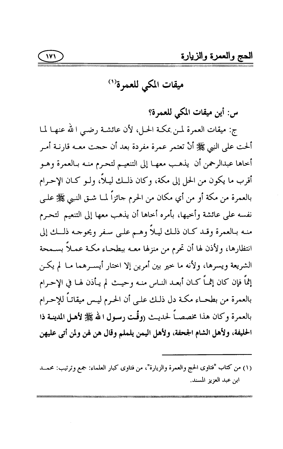 1 من كتاب "فتاوى الحج والعمرة والزيارة"، من فتاوى كبار العلماء: جمع وترتيب: محمد ابن عبد العزيز المسند.