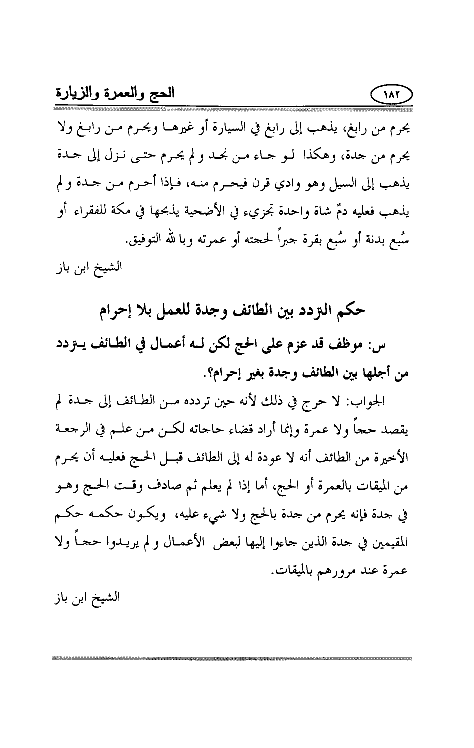 الجواب: لا حرج في ذلك لأنه حين تردده من الطائف إلى جدة لم يقصد حجاً ولا عمرة وإنما أراد قضاء حاجاته لكن من علم في الرجعة الأخيرة من الطائف أنه لا عودة له إلى الطائف قبل الحج فعليه أن يحرم من الميقات بالعمرة أو الحج، أما إذا لم يعلم ثم صادف وقت الحج وهو في جدة فإنه يحرم من جدة بالحج ولا شيء عليه، ويكون حكمه حكم المقيمين في جدة الذين جاءوا إليها لبعض الأعمال ولم يريدوا حجاً ولا عمرة عند مرورهم بالميقات.