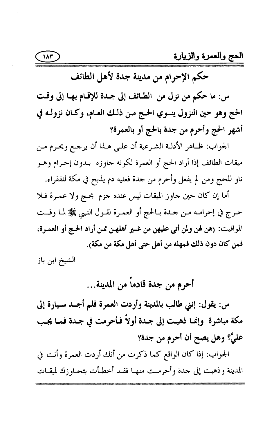 الجواب: ظاهر الأدلة الشرعية أن على هذا أن يرجع ويحرم من ميقات الطائف إذا أراد الحج أو العمرة لكونه جاوزه بدون إحرام وهو ناو للحج ومن لم يفعل وأحرم من جدة فعليه دم يذبح في مكة للفقراء. أما إن كان حين جاوز الميقات ليس عنده جزم بحج ولا عمرة فلا حرج في إحرامه من جدة بالحج أو العمرة لقول النبي صلي الله عليه وسلم لما وقت المواقيت:"هن لهن ولمن أتى عليهن من غير أهلهن ممن أراد الحج أو العمرة، فمن كان دون ذلك فمهله من أهل حتى أهل مكة من مكة".