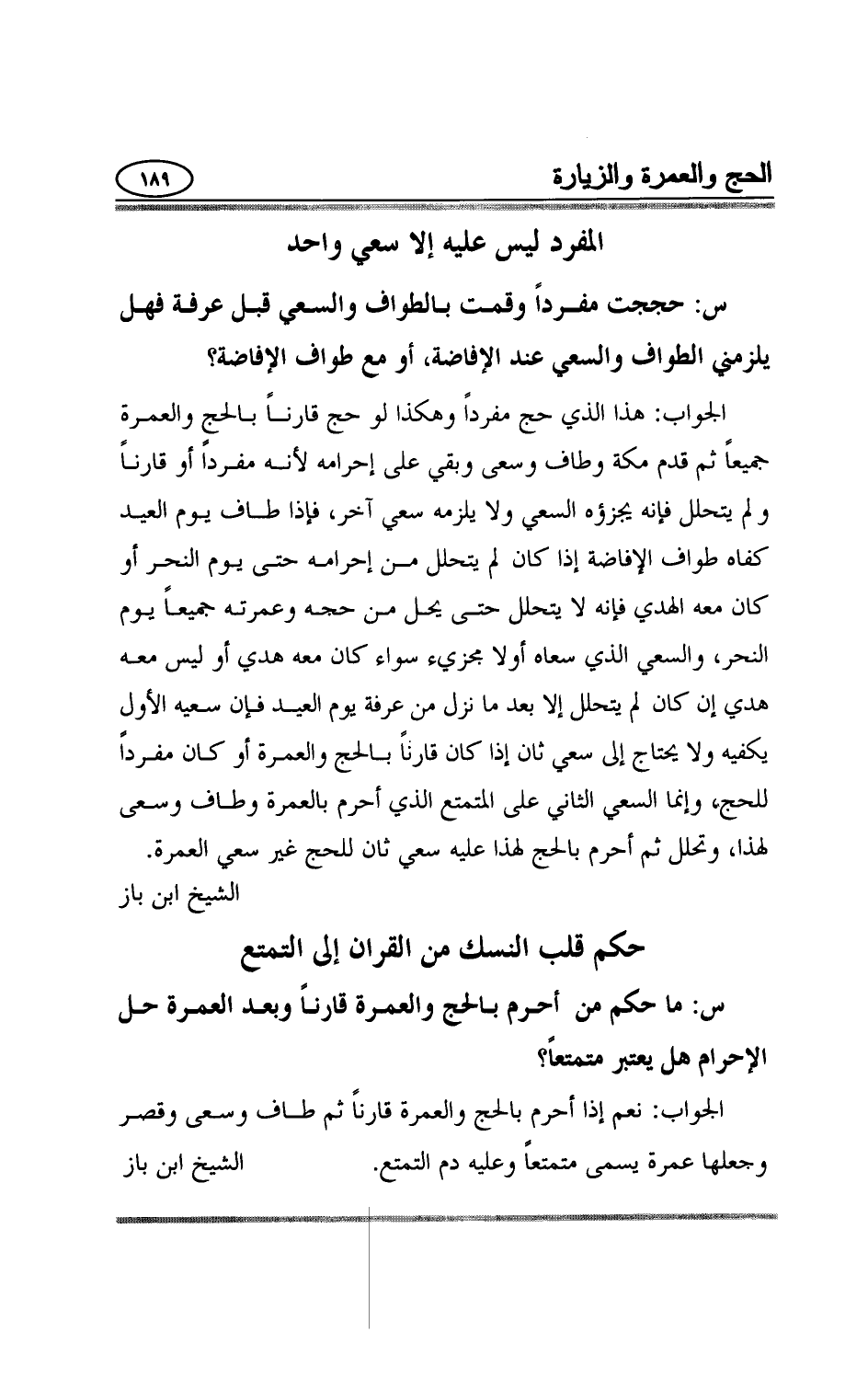 الجواب: هذا الذي حج مفرداً وهكذا لو حج قارناً بالحج والعمرة جميعاً ثم قدم مكة وطاف وسعى وبقي على إحرامه لأنه مفرداً أو قارناً ولم يتحلل فإنه يجزؤه السعي ولا يلزمه سعي آخر، فإذا طاف يوم العيد كفاه طواف الإفاضة إذا كان لم يتحلل من إحرامه حتى يوم النحر أو كان معه الهدي فإنه لا يتحلل حتى يحل من حجه وعمرته جميعاً يوم النحر، والسعي الذي سعاه أولا مجزيء سواء كان معه هدي أو ليس معه هدي إن كان لم يتحلل إلا بعد ما نزل من عرفة يوم العيد فإن سعيه الأول يكفيه ولا يحتاج إلى سعي ثان إذا كان قارناً بالحج والعمرة أو كان مفرداً للحج، وإنما السعي الثاني على المتمتع الذي أحرم بالعمرة وطاف وسعى لهذا، وتحلل ثم أحرم بالحج لهذا عليه سعي ثان للحج غير سعي العمرة.