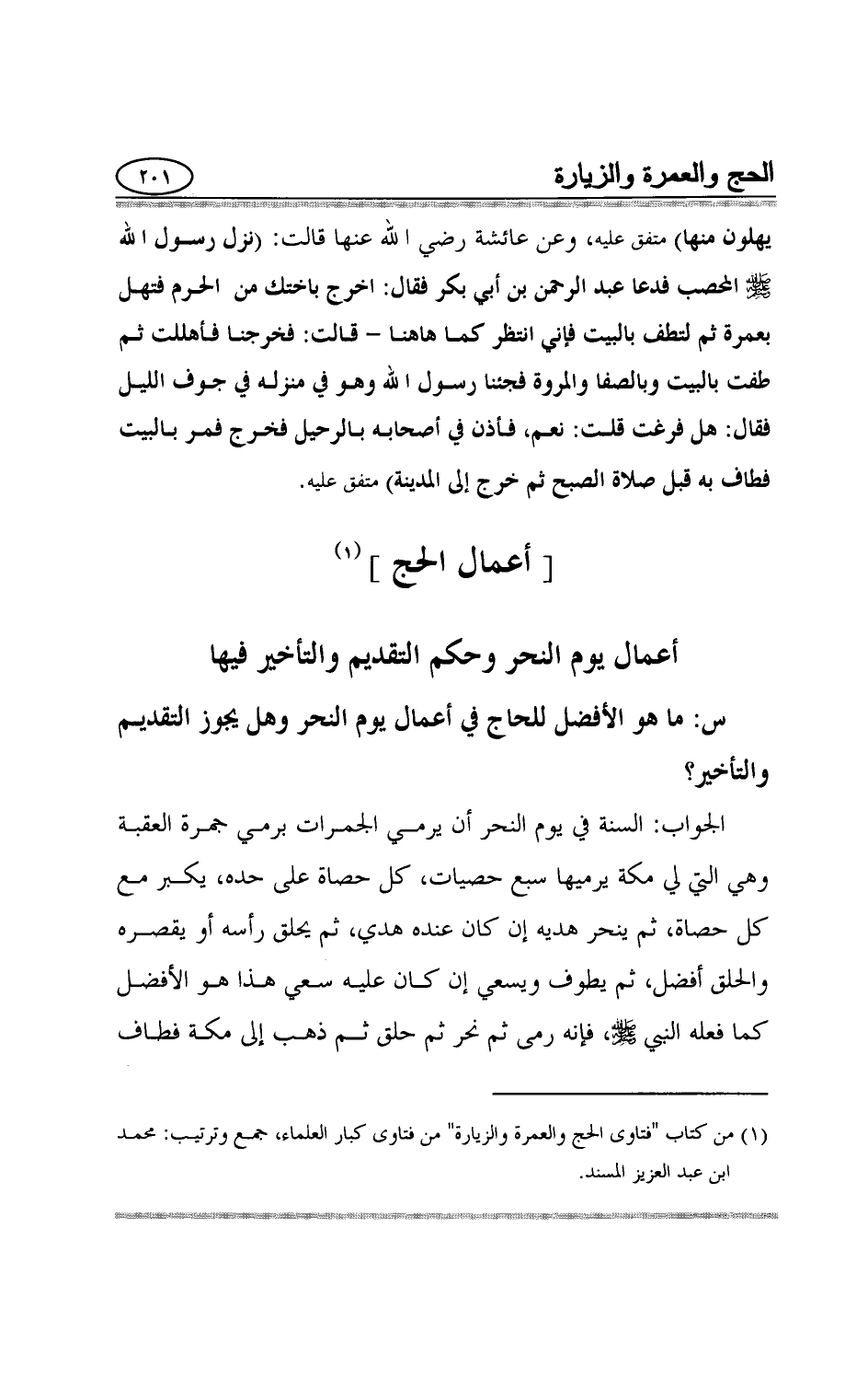 1 من كتاب "فتاوى الحج والعمرة والزيارة" من فتاوى كبار العلماء، جمع وترتيب: محمد ابن عبد العزيز المسند.