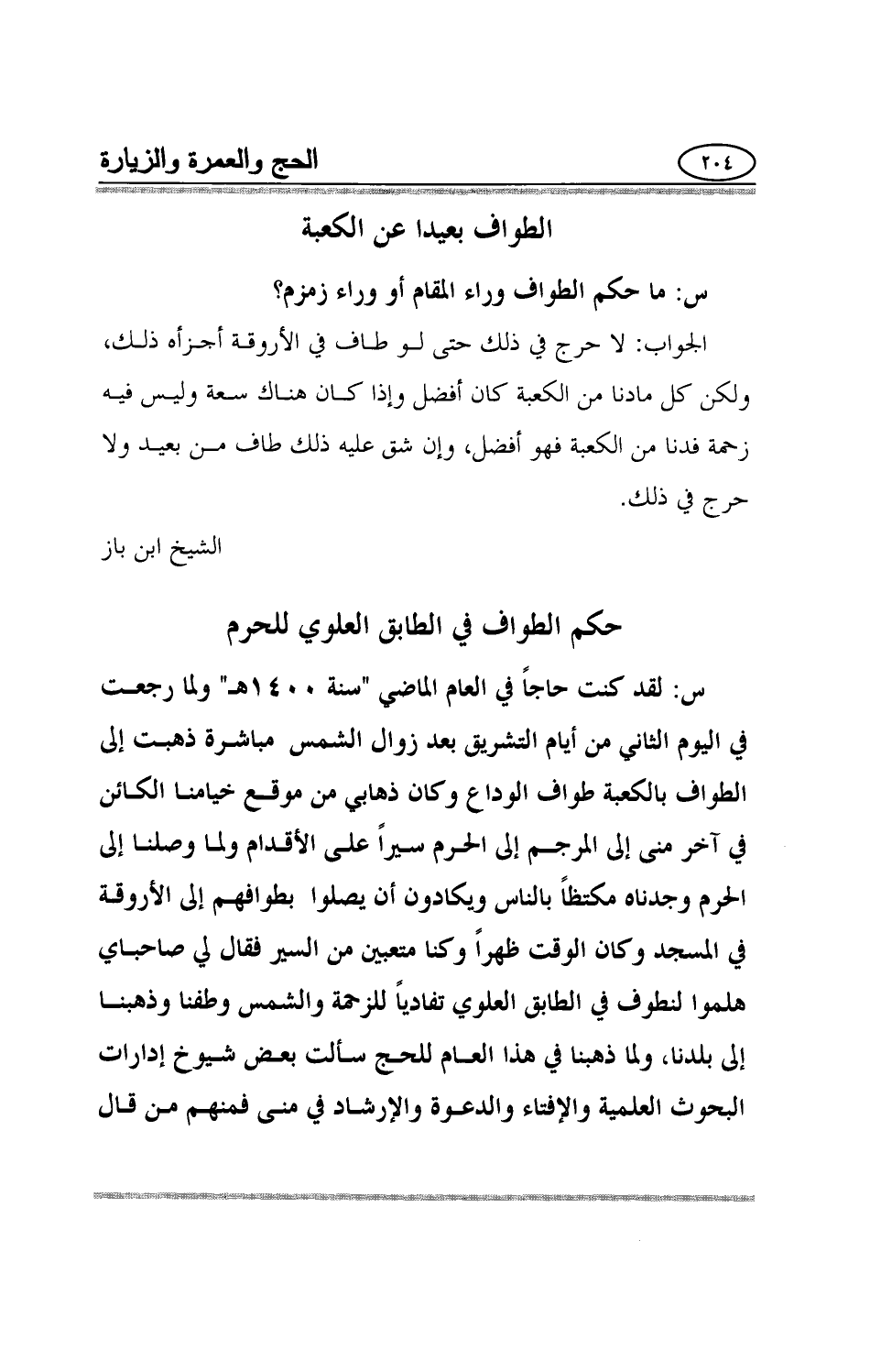س: لقد كنت حاجاً في العام الماضي "سنة 1400هـ" ولما رجعت في اليوم الثاني من أيام التشريق بعد زوال الشمس مباشرة ذهبت إلى الطواف بالكعبة طواف الوداع وكان ذهابي من موقع خيامنا الكائن في آخر منى إلى المرجم إلى الحرم سيراً على الأقدام ولما وصلنا إلى الحرم وجدناه مكتظاً بالناس ويكادون أن يصلوا بطوافهم إلى الأروقة في المسجد وكان الوقت ظهراً وكنا متعبين من السير فقال لي صاحباي هلموا لنطوف في الطابق العلوي تفادياً للزحمة والشمس وطفنا وذهبنا إلى بلدنا، ولما ذهبنا في هذا العام للحج سألت بعض شيوخ إدارات البحوث العلمية والإفتاء والدعوة والإرشاد في منى فمنهم من قال