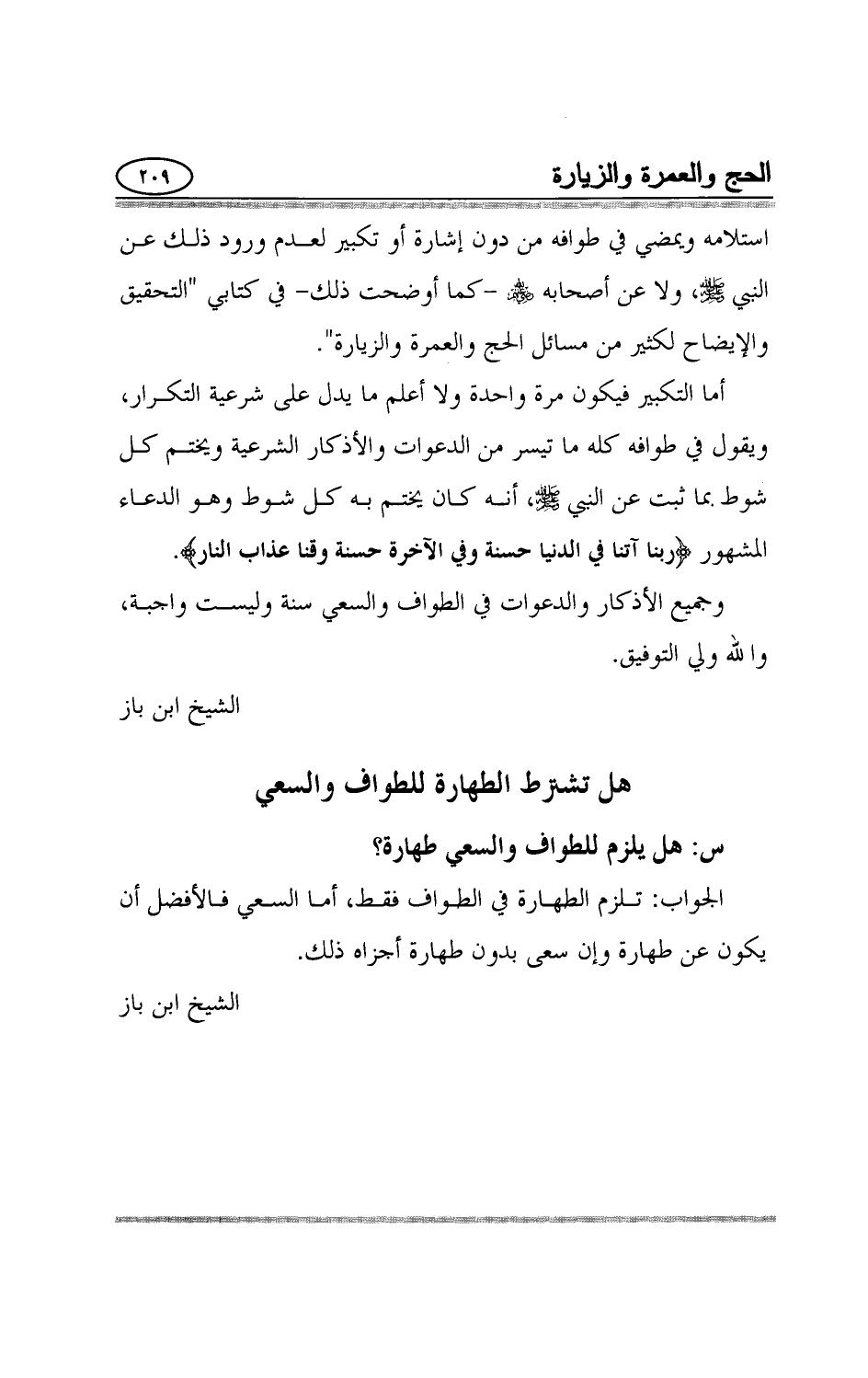 استلامه ويمضي في طوافه من دون إشارة أو تكبير لعدم ورود ذلك عن النبي صلي الله عليه وسلم، ولا عن أصحابه رضي الله عنهم -كما أوضحت ذلك- في كتابي "التحقيق والإيضاح لكثير من مسائل الحج والعمرة والزيارة" أما التكبير فيكون مرة واحدة ولا أعلم ما يدل على شرعية التكرار، ويقول في طوافه كله ما تيسر من الدعوات والأذكار الشرعية ويختم كل شوط بما ثبت عن النبي صلي الله عليه وسلم، أنه كان يختم به كل شوط وهو الدعاء المشهور {رَبَّنَا آتِنَا فِي الدُّنْيَا حَسَنَةً وَفِي الْآخِرَةِ حَسَنَةً وَقِنَا عَذَابَ النَّارِ} وجميع الأذكار والدعوات في الطواف والسعي سنة وليست واجبة، والله ولي التوفيق.