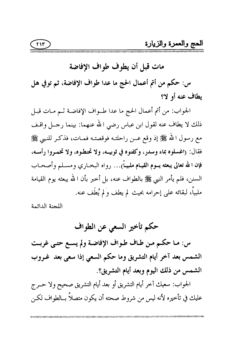 الجواب: من أتم أعمال الحج ما عدا طواف الإفاضة ثم مات قبل ذلك لا يطاف عنه لقول ابن عباس رضي الله عنهما: بينما رجل واقف مع رسول الله صلي الله عليه وسلم إذ وقع عن راحلته فوقصته فمات، فذكر للنبي صلي الله عليه وسلم فقال:" اغسلوه بماء وسدر، وكفنوه في ثوبيه، ولا تحنطوه، ولا تخمروا رأسه، فإن الله تعالى يبعثه يوم القيام ملبياً". رواه البخاري ومسلم وأصحاب السنن، فلم يأمر النبي صلي الله عليه وسلم بالطواف عنه، بل أخبر بأن الله يبعثه يوم القيامة ملبياً، لبقائه على إحرامه بحيث لم يطف ولم يُطَف عنه.