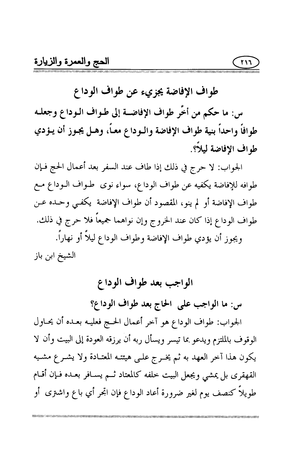 الجواب: لا حرج في ذلك إذا طاف عند السفر بعد أعمال الحج فإن طوافه للإفاضة يكفيه عن طواف الوداع، سواء نوى طواف الوداع مع طواف الإفاضة أو لم ينو، المقصود أن طواف الإفاضة يكفي وحده عن طواف الوداع إذا كان عند الخروج وإن نواهما جميعاً فلا حرج في ذلك. ويجوز أن يؤدي طواف الإفاضة وطواف الوداع ليلاً أو نهاراً.