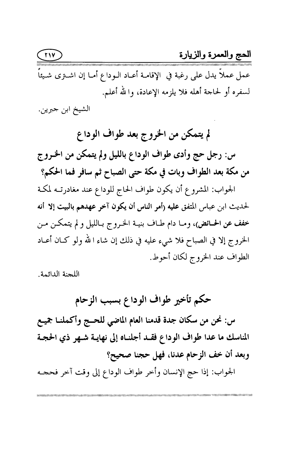 س: رجل حج وأدى طواف الوداع بالليل ولم يتمكن من الخروج من مكة بعد الطواف وبات في مكة حتى الصباح ثم سافر فما الحكم؟