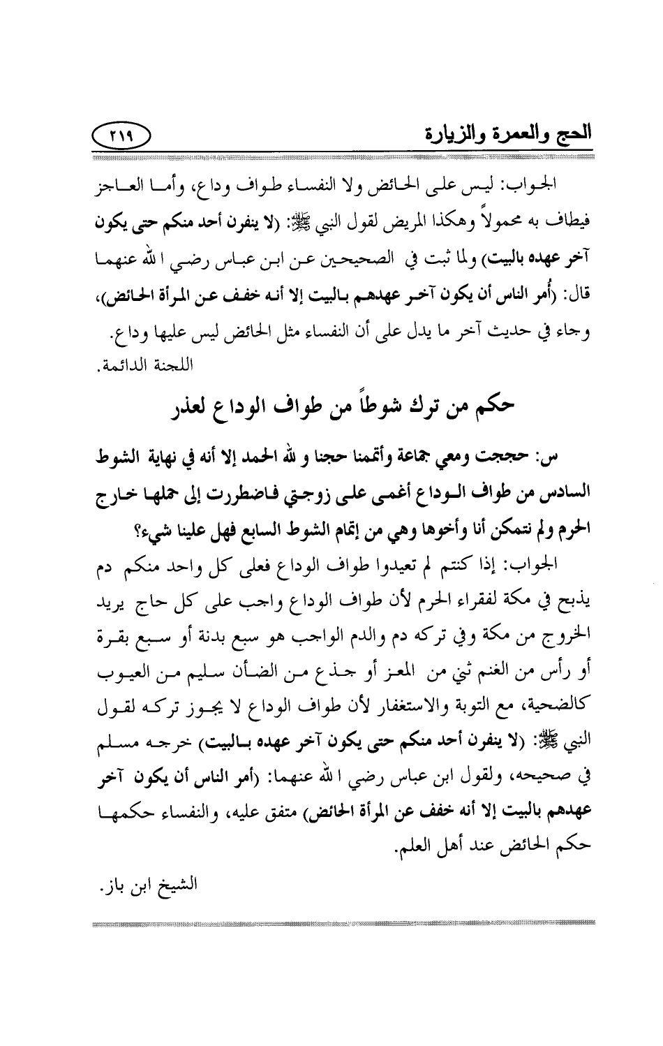 الجواب: ليس على الحائض ولا النفساء طواف وداع، وأما العاجز فيطاف به محمولاً وهكذا المريض لقول النبي صلي الله عليه وسلم:"لا ينفرن أحد منكم حتى يكون آخر عهده بالبيت" ولما ثبت في الصحيحين عن ابن عباس رضي الله عنهما قال:" أُمر الناس أن يكون آخر عهدهم بالبيت إلا أنه خفف عن المرأة الحائض "، وجاء في حديث آخر ما يدل على أن النفساء مثل الحائض ليس عليها وداع.