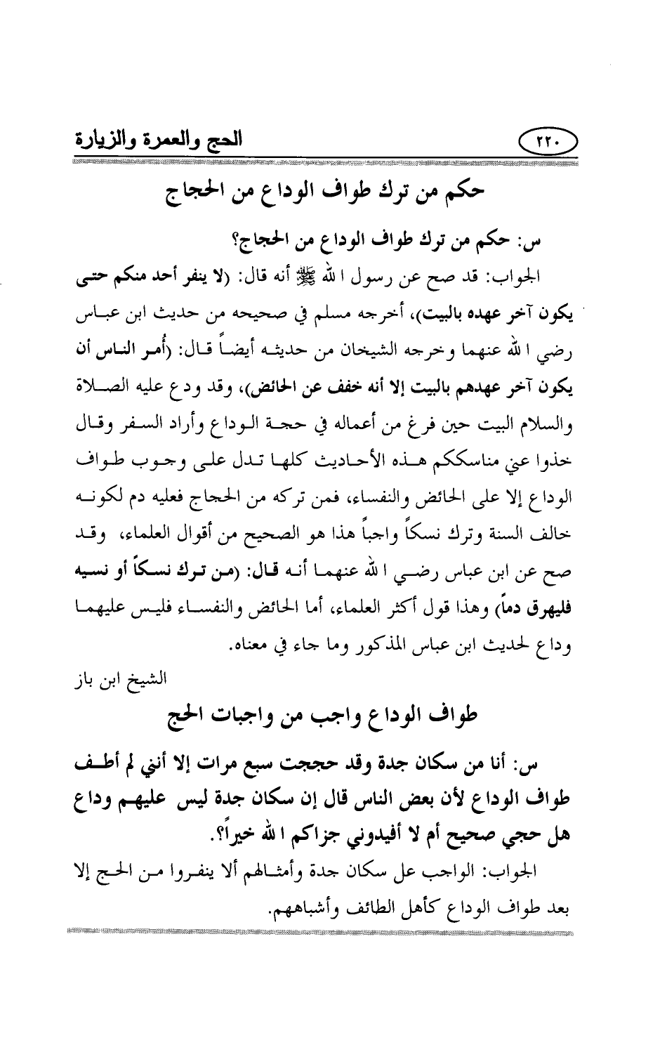 الجواب: قد صح عن رسول الله صلي الله عليه وسلم أنه قال:"لا ينفر أحد منكم حتى يكون آخر عهده بالبيت"، أخرجه مسلم في صحيحه من حديث ابن عباس رضي الله عنهما وخرجه الشيخان من حديثه أيضاً قال:" أُمر الناس أن يكون آخر عهدهم بالبيت إلا أنه خفف عن الحائض "، وقد ودع عليه الصلاة والسلام البيت حين فرغ من أعماله في حجة الوداع وأراد السفر وقال خذوا عني مناسككم هذه الأحاديث كلها تدل على وجوب طواف الوداع إلا على الحائض والنفساء، فمن تركه من الحجاج فعليه دم لكونه خالف السنة وترك نسكاً واجباً هذا هو الصحيح من أقوال العلماء، وقد صح عن ابن عباس رضي الله عنهما أنه قال:" من ترك نسكاً أو نسيه فليهرق دماً" وهذا قول أكثر العلماء، أما الحائض والنفساء فليس عليهما وداع لحديث ابن عباس المذكور وما جاء في معناه.