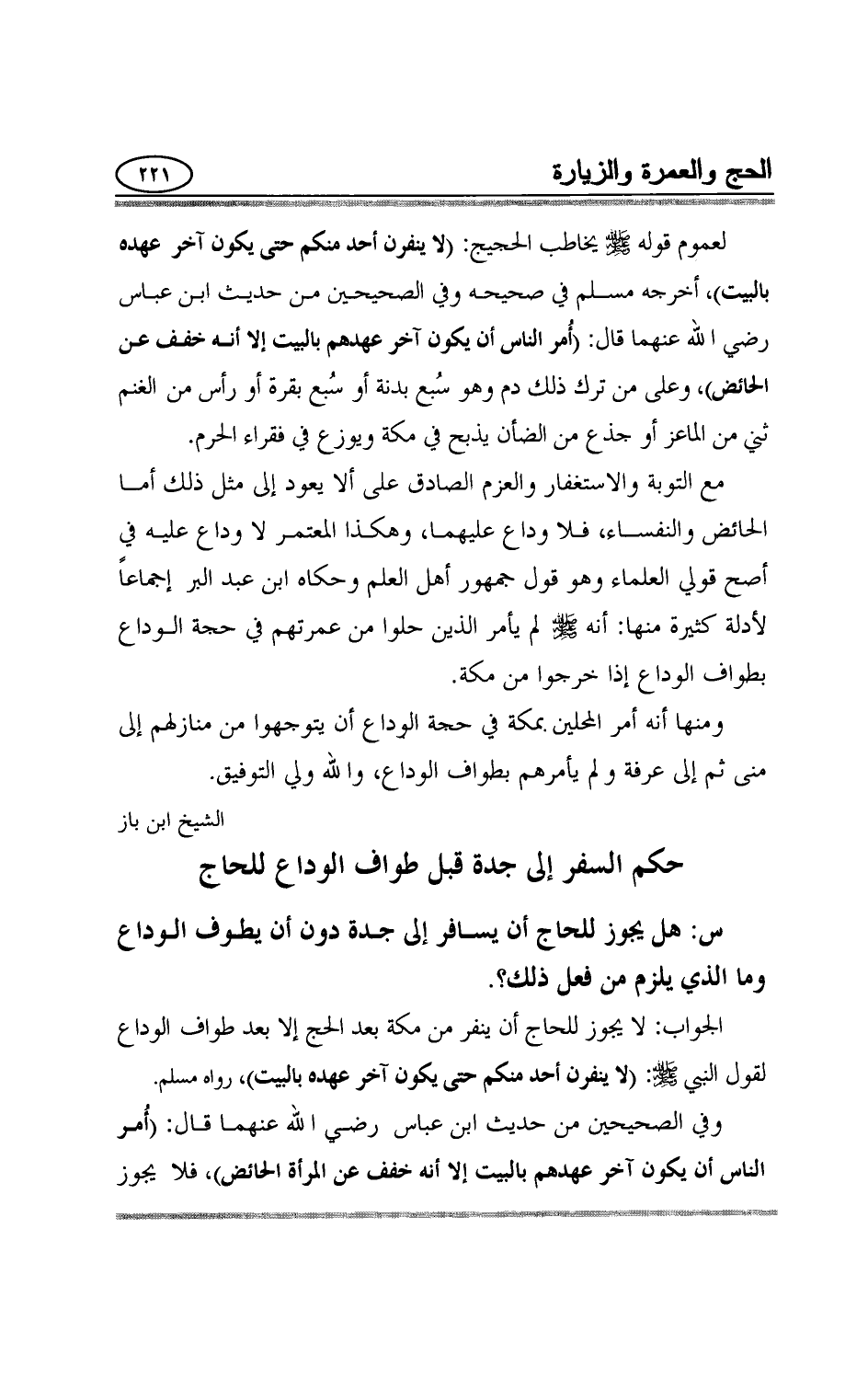 الجواب: لا يجوز للحاج أن ينفر من مكة بعد الحج إلا بعد طواف الوداع لقول النبي صلي الله عليه وسلم:"لا ينفرن أحد منكم حتى يكون آخر عهده بالبيت "، رواه مسلم. وفي الصحيحين من حديث ابن عباس رضي الله عنهما قال:"أُمر الناس أن يكون آخر عهدهم بالبيت إلا أنه خفف عن المرأة الحائض"، فلا يجوز