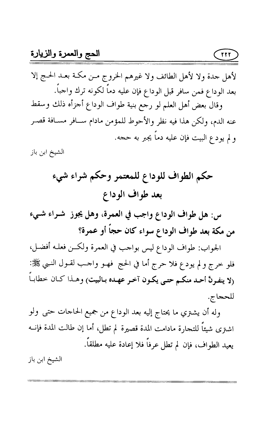 لأهل جدة ولا لأهل الطائف ولا غيرهم الخروج من مكة بعد الحج إلا بعد الوداع فمن سافر قبل الوداع فإن عليه دماً لكونه ترك واجباً. وقال بعض أهل العلم لو رجع بنية طواف الوداع أجزأه ذلك وسقط عنه الدم، ولكن هذا فيه نظر والأحوط للمؤمن مادام سافر مسافة قصر ولم يودع البيت فإن عليه دماً يجبر به حجه.