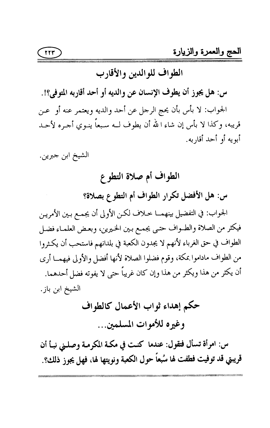 الجواب: لا بأس بأن يحج الرجل عن أحد والديه ويعتمر عنه أو عن قريبه، وكذا لا بأس إن شاء الله أن يطوف له سبعاً ينوي أجره لأحد أبويه أو أحد أقاربه.