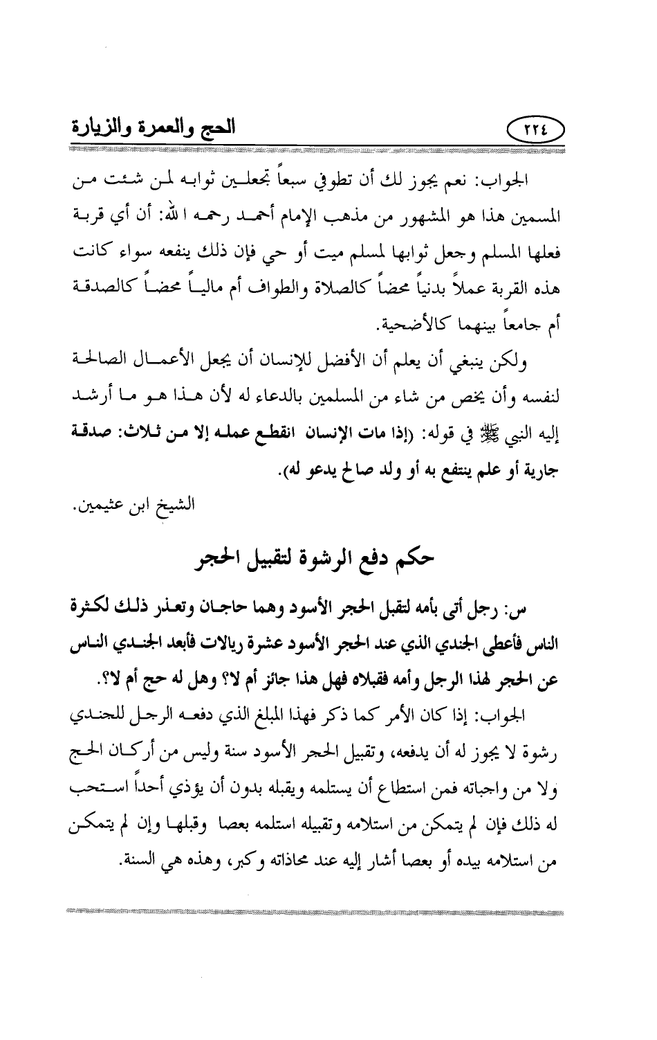 الجواب: إذا كان الأمر كما ذكر فهذا المبلغ الذي دفعه الرجل للجندي رشوة لا يجوز له أن يدفعه، وتقبيل الحجر الأسود سنة وليس من أركان الحج ولا من واجباته فمن استطاع أن يستلمه ويقبله بدون أن يؤذي أحداً استحب له ذلك فإن لم يتمكن من استلامه وتقبيله استلمه بعصا وقبلها وإن لم يتمكن من استلامه بيده أو بعصا أشار إليه عند محاذاته وكبر، وهذه هي السنة.