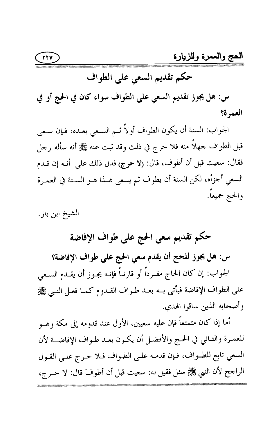 الجواب: الصواب أنه لا فرق بين يوم العيد وغيره في أنه يجوز تقديم السعي على الطواف حتى لو كان بعد يوم العيد لعموم الحديث، حيث قال رجل للنبي صلي الله عليه وسلم سعيت قبل أن أطوف قال:"لا حرج" وإذا كان الحديث عاماً فإنه لا فرق بين أن يأتي ذلك في يوم العيد أو فيما بعده.