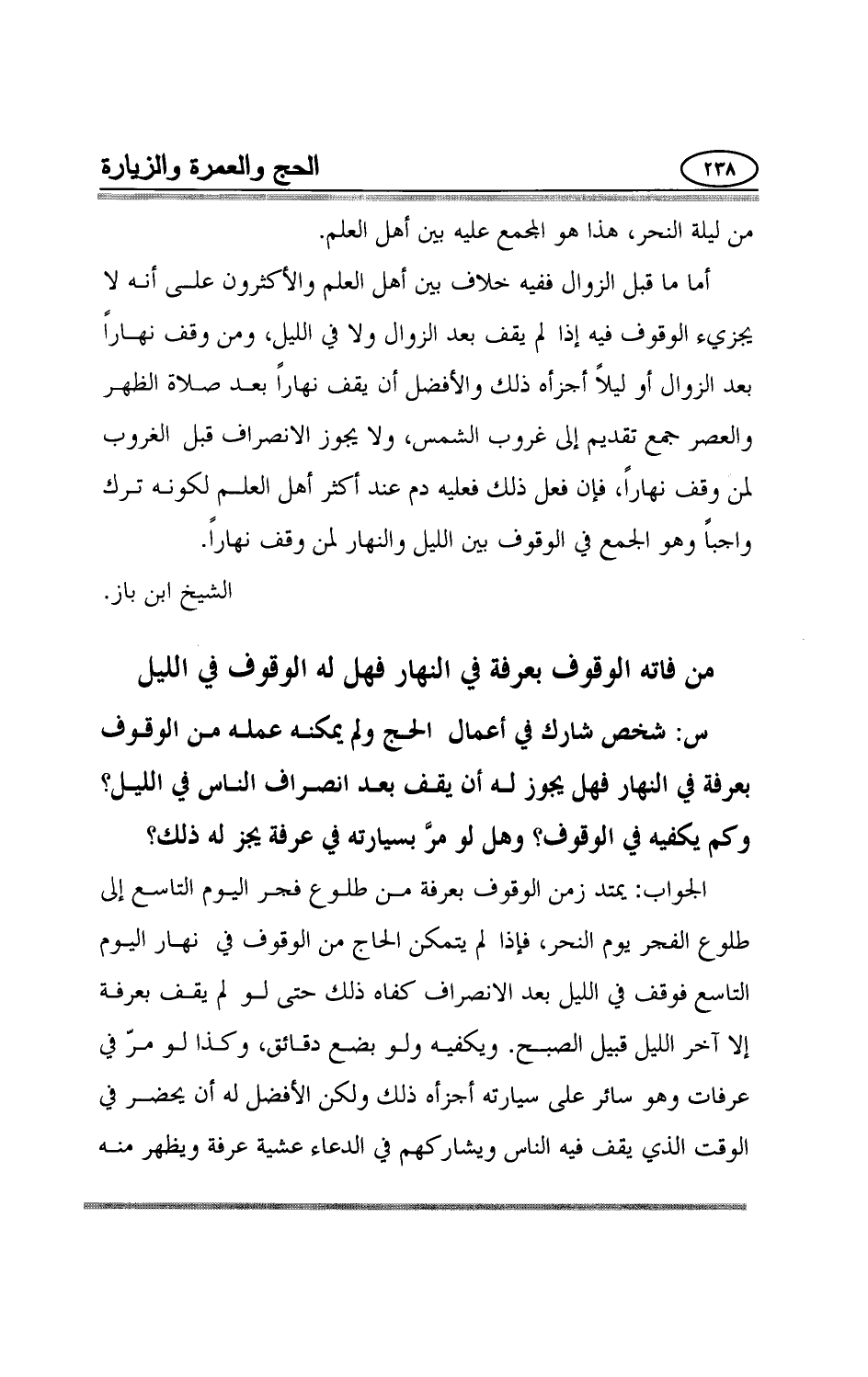 من ليلة النحر، هذا هو المجمع عليه بين أهل العلم. أما ما قبل الزوال ففيه خلاف بين أهل العلم والأكثرون على أنه لا يجزيء الوقوف فيه إذا لم يقف بعد الزوال ولا في الليل، ومن وقف نهاراً بعد الزوال أو ليلاً أجزأه ذلك والأفضل أن يقف نهاراً بعد صلاة الظهر والعصر جمع تقديم إلى غروب الشمس، ولا يجوز الانصراف قبل الغروب لمن وقف نهاراً، فإن فعل ذلك فعليه دم عند أكثر أهل العلم لكونه ترك واجباً وهو الجمع في الوقوف بين الليل والنهار لمن وقف نهاراً.