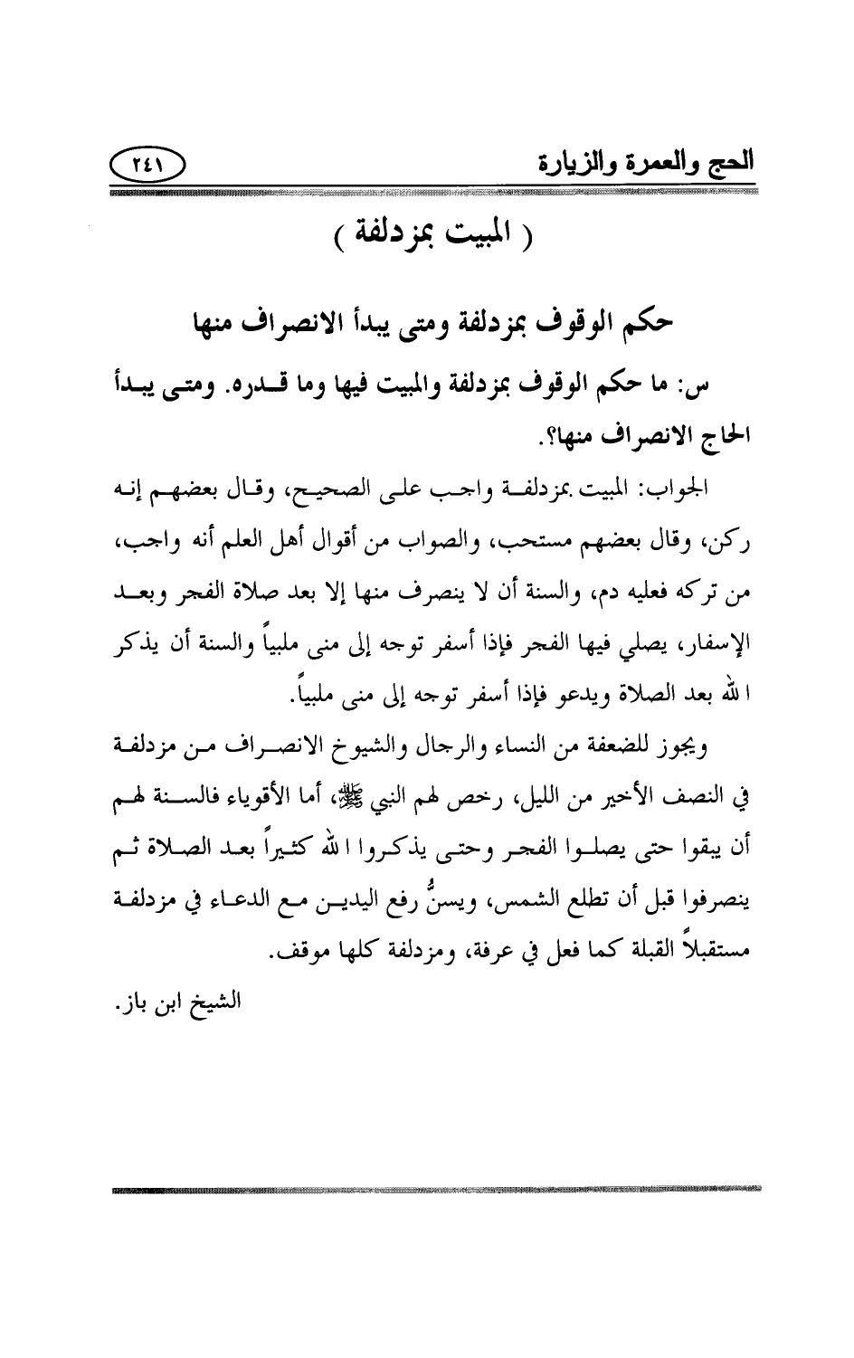 الجواب: المبيت بمزدلفة واجب على الصحيح، وقال بعضهم إنه ركن، وقال بعضهم مستحب، والصواب من أقوال أهل العلم أنه واجب، من تركه فعليه دم، والسنة أن لا ينصرف منها إلا بعد صلاة الفجر وبعد الإسفار، يصلي فيها الفجر فإذا أسفر توجه إلى منى ملبياً والسنة أن يذكر الله بعد الصلاة ويدعو فإذا أسفر توجه إلى منى ملبياً. ويجوز للضعفة من النساء والرجال والشيوخ الانصراف من مزدلفة في النصف الأخير من الليل، رخص لهم النبي صلي الله عليه وسلم، أما الأقوياء فالسنة لهم أن يبقوا حتى يصلوا الفجر وحتى يذكروا الله كثيراً بعد الصلاة ثم ينصرفوا قبل أن تطلع الشمس، ويسنُّ رفع اليدين مع الدعاء في مزدلفة مستقبلاً القبلة كما فعل في عرفة، ومزدلفة كلها موقف.
