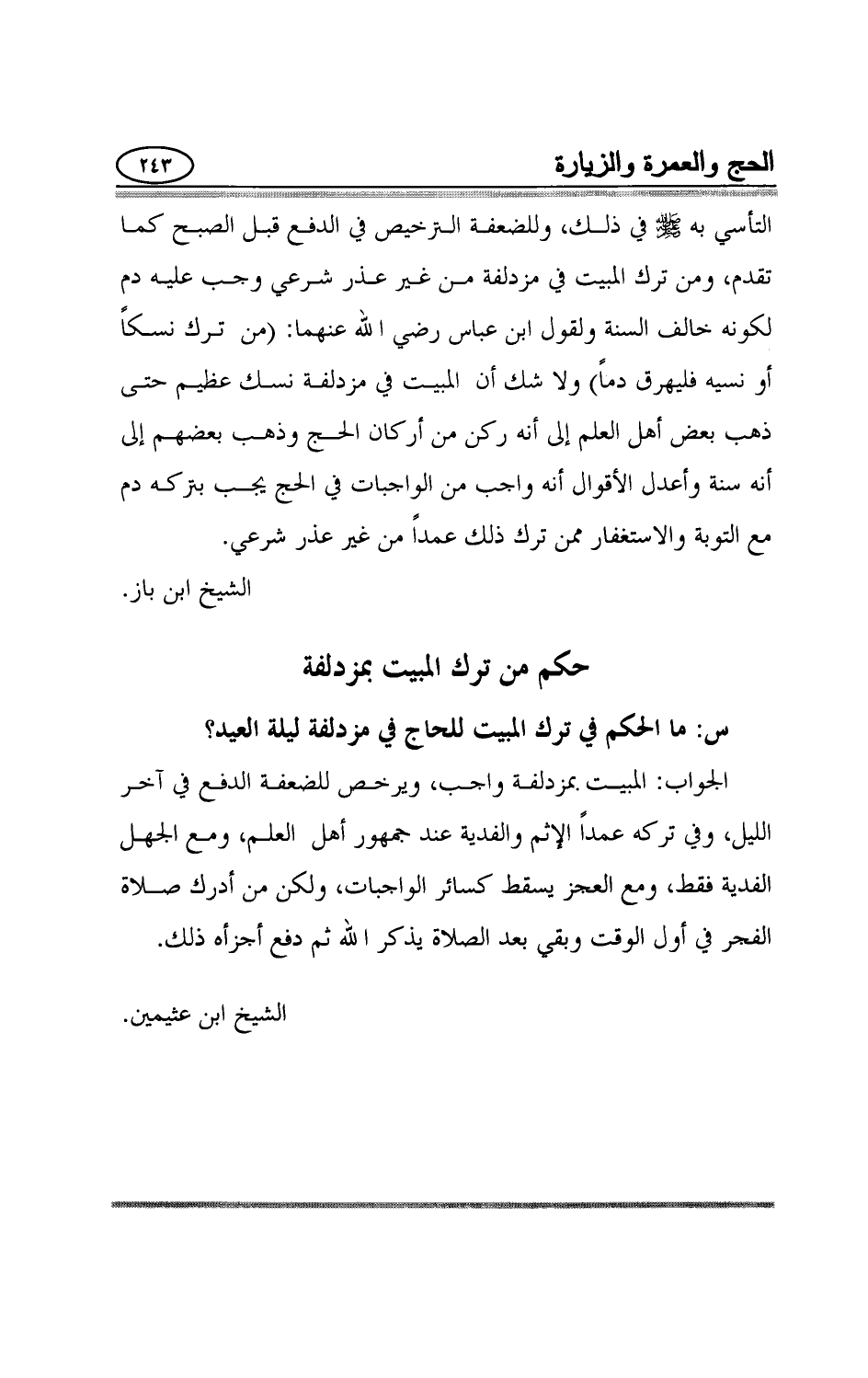 س: ما الحكم في ترك المبيت للحاج في مزدلفة ليلة العيد؟