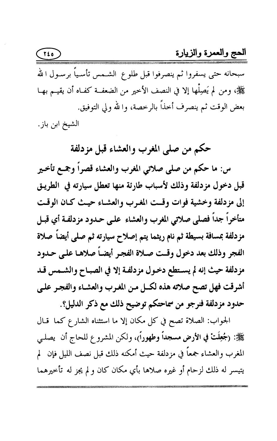 س: ما حكم من صلى صلاتي المغرب والعشاء قصراً وجمع تأخير قبل دخول مزدلفة وذلك لأسباب طارئة منها تعطل سيارته في الطريق إلى مزدلفة وخشية فوات وقت المغرب والعشاء حيث كان الوقت متأخراً جداً فصلى صلاتي المغرب والعشاء على حدود مزدلفة أي قبل مزدلفة بمسافة بسيطة ثم نام ريثما يتم إصلاح سيارته ثم صلى أيضاً صلاة الفجر وذلك بعد دخول وقت صلاة الفجر أيضاً صلاها على حدود مزدلفة حيث إنه لم يستطع دخول مزدلفة إلا في الصباح والشمس قد أشرقت فهل تصح صلاته هذه لكل من المغرب والعشاء والفجر على حدود مزدلفة فنرجو من سماحتكم توضيح ذلك مع ذكر الدليل؟.