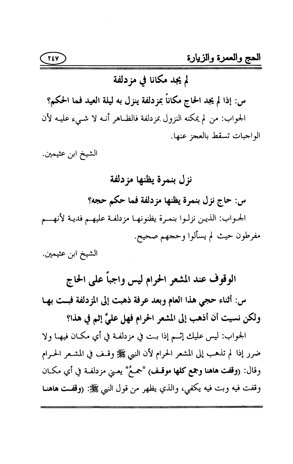 الجواب: ليس عليك إثم إذا بت في مزدلفة في أي مكان فيها ولا ضرر إذا لم تذهب إلى المشعر الحرام لأن النبي صلي الله عليه وسلم وقف في المشعر الحرام وقال:"وقفت هاهنا