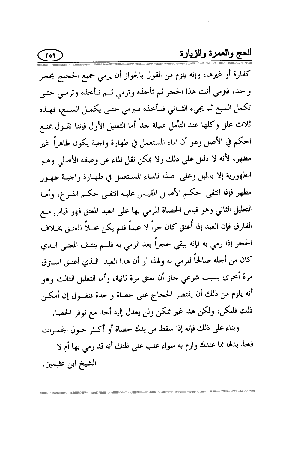 كفارة أو غيرها، وإنه يلزم من القول بالجواز أن يرمي جميع الحجيج بحجر واحد، فترمي أنت هذا الحجر ثم تأخذه وترمي ثم تأخذه وترمي حتى تكمل السبع ثم يجيء الثاني فيأخذه فيرمي حتى يكمل السبع، فهذه ثلاث علل وكلها عند التأمل عليلة جداً أما التعليل الأول فإننا نقول بمنع الحكم في الأصل وهو أن الماء المستعمل في طهارة واجبة يكون طاهراً غير مطهر، لأنه لا دليل على ذلك ولا يمكن نقل الماء عن وصفه الأصلي وهو الطهورية إلا بدليل وعلى هذا فالماء المستعمل في طهارة واجبة طهور مطهر فإذا انتفى حكم الأصل المقيس عليه انتفى حكم الفرع، وأما التعليل الثاني وهو قياس الحصاة المرمي بها على العبد المعتق فهو قياس مع الفارق فإن العبد إذا أُعتق كان حراً لا عبداً فلم يكن محلاً للعتق بخلاف الحجر إذا رمي به فإنه يبقى حجراً بعد الرمي به فلم ينتف المعنى الذي كان من أجله صالحاً للرمي به ولهذا لو أن هذا العبد الذي أعتق استرق مرة أخرى بسبب شرعي جاز أن يعتق مرة ثانية، وأما التعليل الثالث وهو أنه يلزم من ذلك أن يقتصر الحجاج على حصاة واحدة فنقول إن أمكن ذلك فليكن، ولكن هذا غير ممكن ولن يعدل إليه أحد مع توفر الحصا. وبناء على ذلك فإنه إذا سقط من يدك حصاة أو أكثر حول الجمرات فخذ بدلها مما عندك وارم به سواء غلب على ظنك أنه قد رمي بها أم لا.