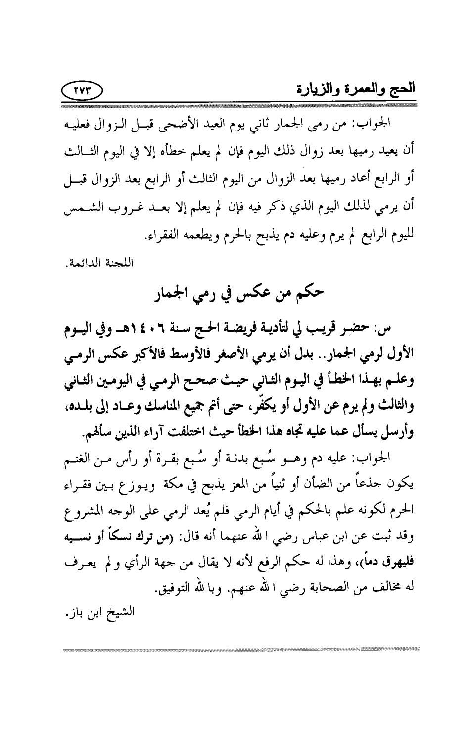 س: حضر قريب لي لتأدية فريضة الحج سنة 1406هـ وفي اليوم الأول لرمي الجمار.. بدل أن يرمي الأصغر فالأوسط فالأكبر عكس الرمي وعلم بهذا الخطأ في اليوم الثاني حيث صحح الرمي في اليومين الثاني والثالث ولم يرم عن الأول أو يكفّر، حتى أتم جميع المناسك وعاد إلى بلده، وأرسل يسأل عما عليه تجاه هذا الخطأ حيث اختلفت آراء الذين سألهم.