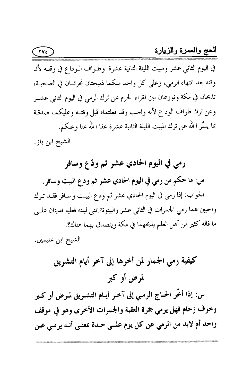 في اليوم الثاني عشر ومبيت الليلة الثانية عشرة وطواف الوداع في وقته لأن وقته بعد انتهاء الرمي، وعلى كل واحد منكما ذبيحتان تجزئان في الضحية، تذبحان في مكة وتوزعان بين فقراء الحرم عن ترك الرمي في اليوم الثاني عشر وعن ترك طواف الوداع لأنه واجب وقد فعلتماه قبل وقته وعليكما صدقة بما يسَّر الله عن ترك المبيت الليلة الثانية عشرة عفا الله عنا وعنكم.