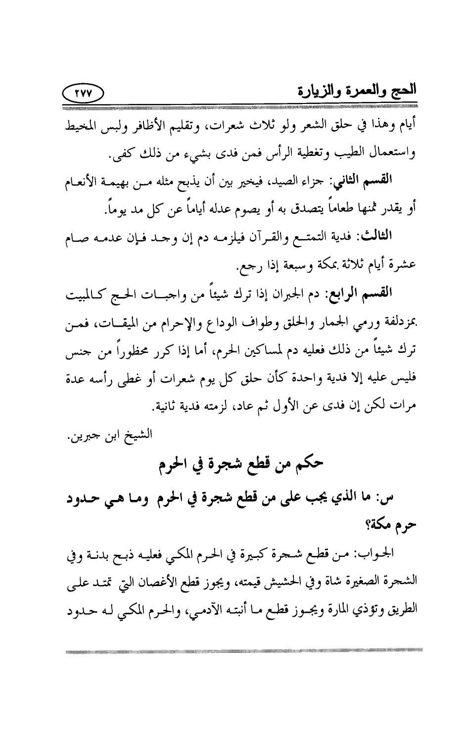 الجواب: من قطع شجرة كبيرة في الحرم المكي فعليه ذبح بدنة وفي الشجرة الصغيرة شاة وفي الحشيش قيمته، ويجوز قطع الأغصان التي تمتد على الطريق وتؤذي المارة ويجوز قطع ما أنبته الآدمي، والحرم المكي له حدود