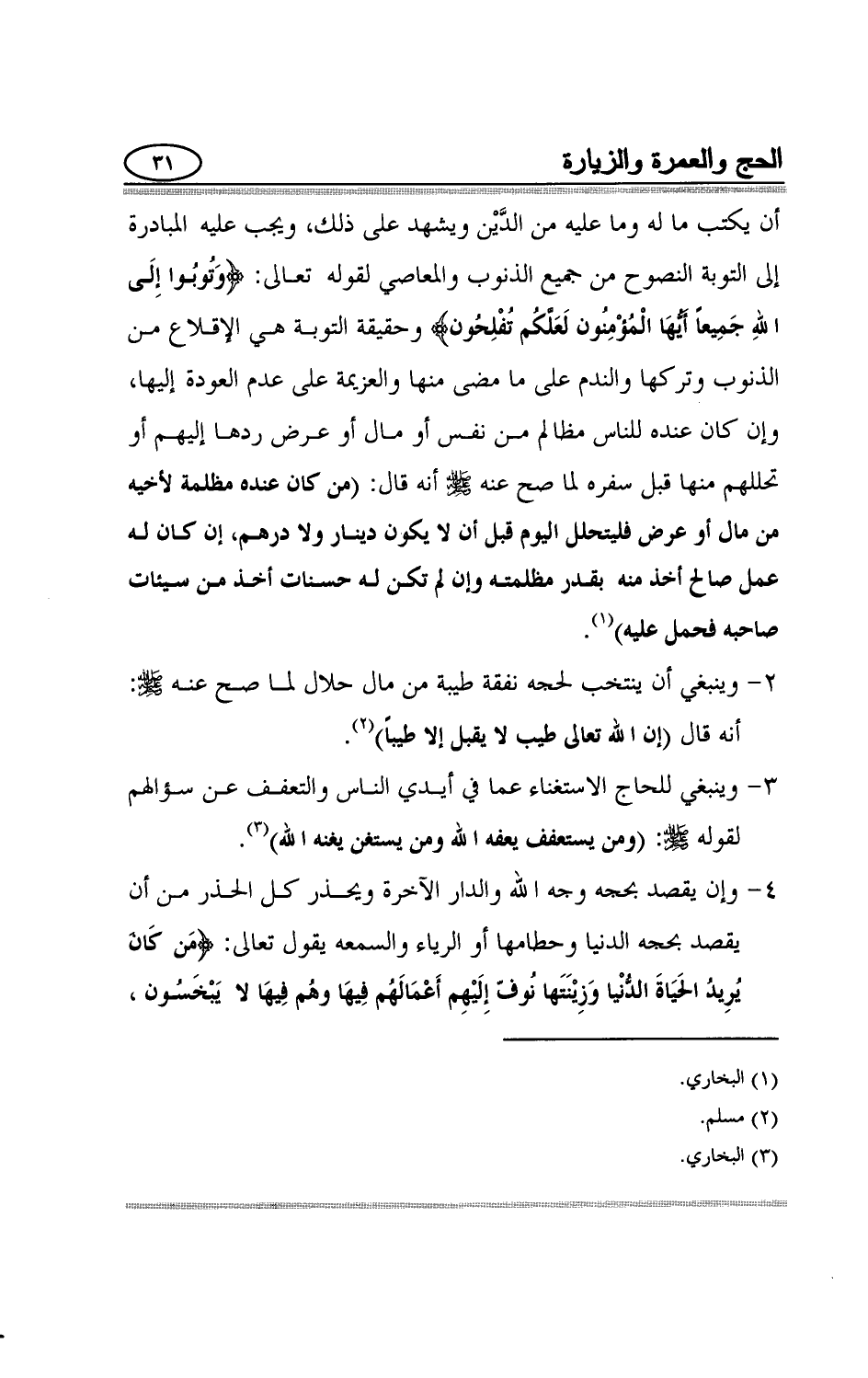 4- وإن يقصد بحجه وجه الله والدار الآخرة ويحذر كل الحذر من أن يقصد بحجه الدنيا وحطامها أو الرياء والسمعه يقول تعالى: {مَن كَانَ يُرِيدُ الحَيَاةَ الدُّنْيا وَزِيْنَتَها نُوفّ إِلَيْهِم أَعْمَالَهُم فِيهَا وهُم فِيهَا لا يَبْخَسُون،