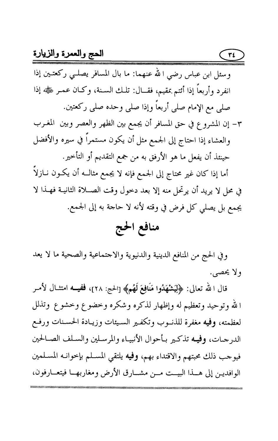 3- إن المشروع في حق المسافر أن يجمع بين الظهر والعصر وبين المغرب والعشاء إذا احتاج إلى الجمع مثل أن يكون مستمراً في سيره والأفضل حينئذ أن يفعل ما هو الأرفق به من جمع التقديم أو التأخير أما إذا كان غير محتاج إلى الجمع فإنه لا يجمع مثاله أن يكون نازلاً في محل لا يريد أن يرتحل منه إلا بعد دخول وقت الصلاة الثانية فهذا لا يجمع بل يصلي كل فرض في وقته لأنه لا حاجة به إلى الجمع.