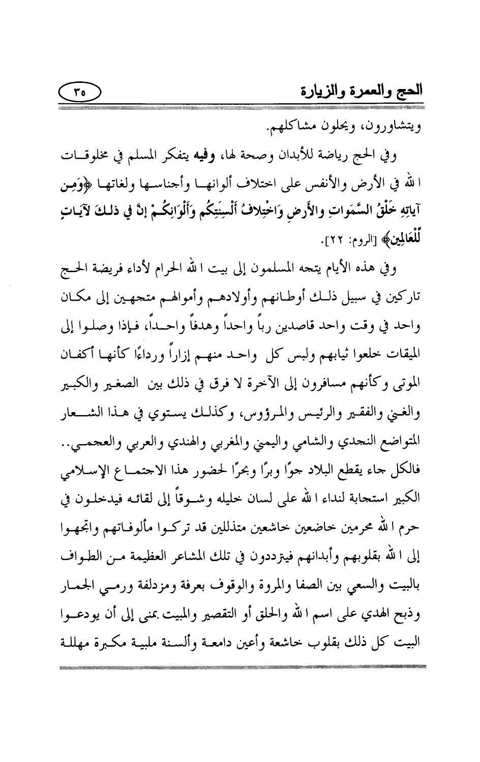 ويتشاورون، ويحلون مشاكلهم وفي الحج رياضة للأبدان وصحة لها، وفيه يتفكر المسلم في مخلوقات الله في الأرض والأنفس على اختلاف ألوانها وأجناسها ولغاتها {وَمِنْ آيَاتِهِ خَلْقُ السَّمَاوَاتِ وَالْأَرْضِ وَاخْتِلافُ أَلْسِنَتِكُمْ وَأَلْوَانِكُمْ إِنَّ فِي ذَلِكَ لَآياتٍ لِلْعَالِمِينَ} [الروم:22] وفي هذه الأيام يتجه المسلمون إلى بيت الله الحرام لأداء فريضة الحج تاركين في سبيل ذلك أوطانهم وأولادهم وأموالهم متجهين إلى مكان واحد في وقت واحد قاصدين رباً واحداً وهدفاً واحداً، فإذا وصلوا إلى الميقات خلعوا ثيابهم ولبس كل واحد منهم إزاراً ورداءًا كأنها أكفان الموتى وكأنهم مسافرون إلى الآخرة لا فرق في ذلك بين الصغير والكبير والغني والفقير والرئيس والمرؤوس، وكذلك يستوي في هذا الشعار المتواضع النجدي والشامي واليمني والمغربي والهندي والعربي والعجمي.. فالكل جاء يقطع البلاد جوًا وبرًا وبحرًا لحضور هذا الاجتماع الإسلامي الكبير استجابة لنداء الله على لسان خليله وشوقاً إلى لقائه فيدخلون في حرم الله محرمين خاضعين خاشعين متذللين قد تركوا مألوفاتهم واتجهوا إلى الله بقلوبهم وأبدانهم فيترددون في تلك المشاعر العظيمة من الطواف بالبيت والسعي بين الصفا والمروة والوقوف بعرفة ومزدلفة ورمي الجمار وذبح الهدي على اسم الله والحلق أو التقصير والمبيت بمنى إلى أن يودعوا البيت كل ذلك بقلوب خاشعة وأعين دامعة وألسنة ملبية مكبرة مهللة