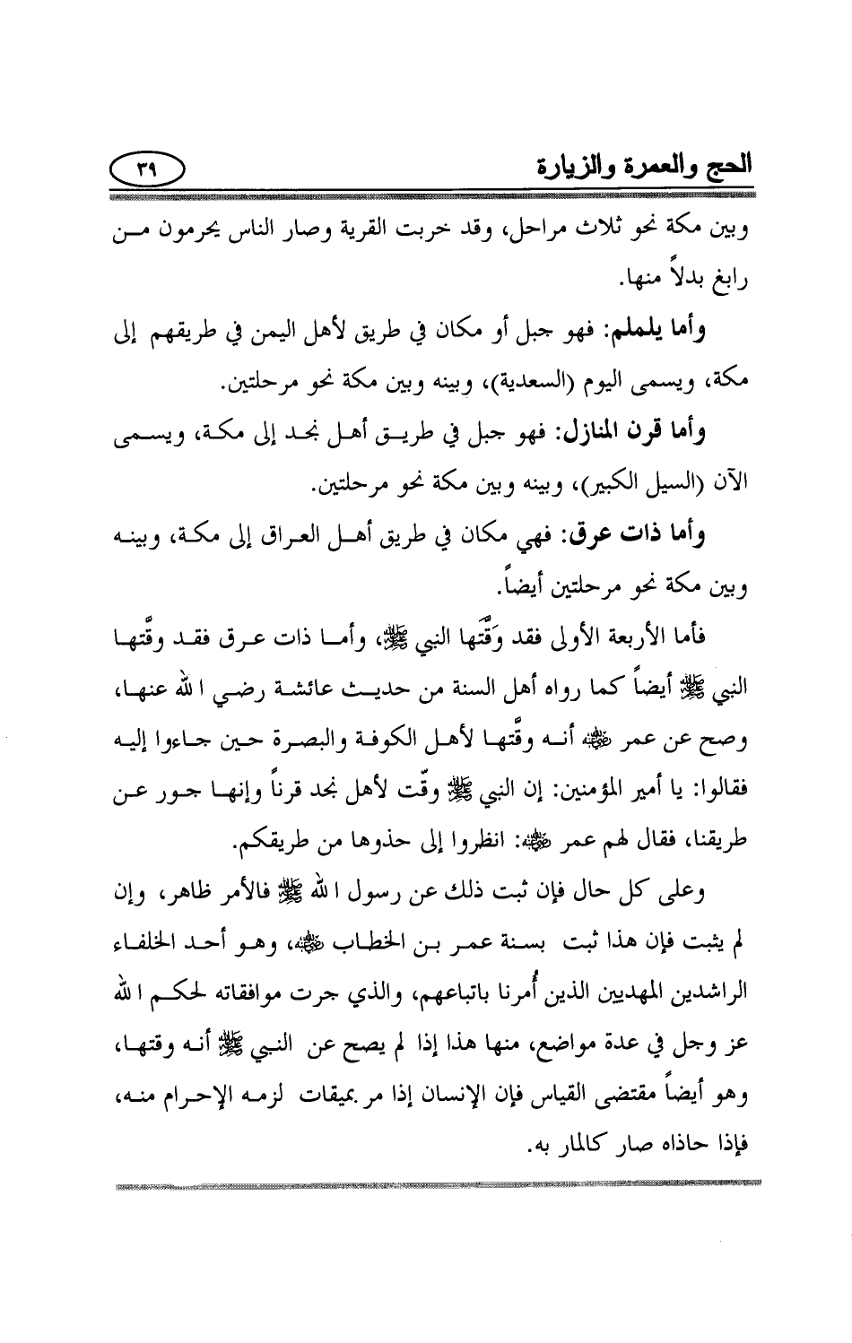 فأما الأربعة الأولى فقد وَقَّتَها النبي صلي الله عليه وسلم، وأما ذات عرق فقد وقَّتها النبي صلي الله عليه وسلم أيضاً كما رواه أهل السنة من حديث عائشة رضي الله عنها، وصح عن عمر رضي الله عنه أنه وقَّتها لأهل الكوفة والبصرة حين جاءوا إليه فقالوا: يا أمير المؤمنين: إن النبي صلي الله عليه وسلم وقّت لأهل نجد قرناً وإنها جور عن طريقنا، فقال لهم عمر رضي الله عنه: انظروا إلى حذوها من طريقكم وعلى كل حال فإن ثبت ذلك عن رسول الله صلي الله عليه وسلم فالأمر ظاهر، وإن لم يثبت فإن هذا ثبت بسنة عمر بن الخطاب رضي الله عنه، وهو أحد الخلفاء الراشدين المهديين الذين أُمرنا باتباعهم، والذي جرت موافقاته لحكم الله عز وجل في عدة مواضع، منها هذا إذا لم يصح عن النبي صلي الله عليه وسلم أنه وقتها، وهو أيضاً مقتضى القياس فإن الإنسان إذا مر بميقات لزمه الإحرام منه، فإذا حاذاه صار كالمار به.