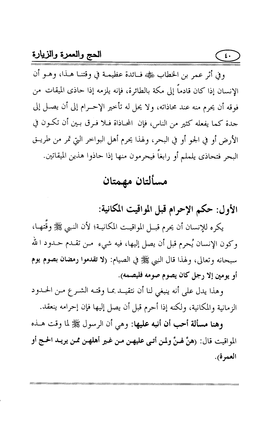 وفي أثر عمر بن الخطاب رضي الله عنه فائدة عظيمة في وقتنا هذا، وهو أن الإنسان إذا كان قادماً إلى مكة بالطائرة، فإنه يلزمه إذا حاذى الميقات من فوقه أن يحرم منه عند محاذاته، ولا يحل له تأخير الإحرام إلى أن يصل إلى جدة كما يفعله كثير من الناس، فإن المحاذاة فلا فرق بين أن تكون في الأرض أو في الجو أو في البحر، ولهذا يحرم أهل البواخر التي تمر من طريق البحر فتحاذى يلملم أو رابغاً فيحرمون منها إذا حاذوا هذين الميقاتين.