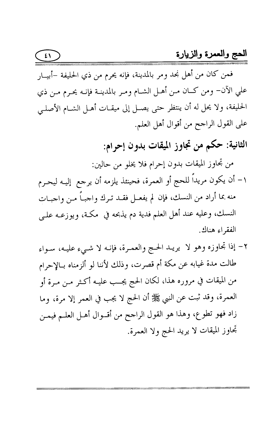 2- إذا تجاوزه وهو لا يريد الحج والعمرة، فإنه لا شيء عليه، سواء طالت مدة غيابه عن مكة أم قصرت، وذلك لأننا لو ألزمناه بالإحرام من الميقات في مروره هذا، لكان الحج يجب عليه أكثر من مرة أو العمرة، وقد ثبت عن النبي صلي الله عليه وسلم أن الحج لا يجب في العمر إلا مرة، وما زاد فهو تطوع، وهذا هو القول الراجح من أقوال أهل العلم فيمن تجاوز الميقات لا يريد الحج ولا العمرة.